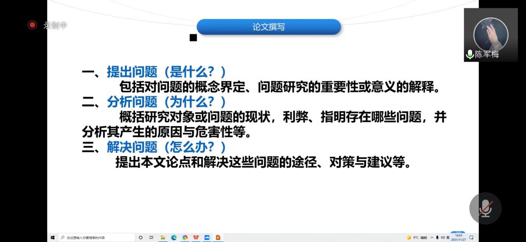 所问方有所思,故得其法。陈军梅将论文撰写分为提出问题、分析问题和解决问题。提出问题时要对问题的概念进行界定,明确问题研究的重要性,并对其意义的进行解释。在分析问题方面,陈军梅表示要注意概率研究对象的现状、利弊,指明存在的问题,并分析其产生的原因与危害性。最后提出本文论点和解决问题的途径、对策与建议。同学们就自己的疑惑之处积极提问,陈军梅针对性地解答了相关问题。论文写作是作者学识的自然流露、学术思想的自然呈现,陈军梅建议同学们根据自己的能力以及个人老师的意见完成撰写,以一时文章,明千古之事。