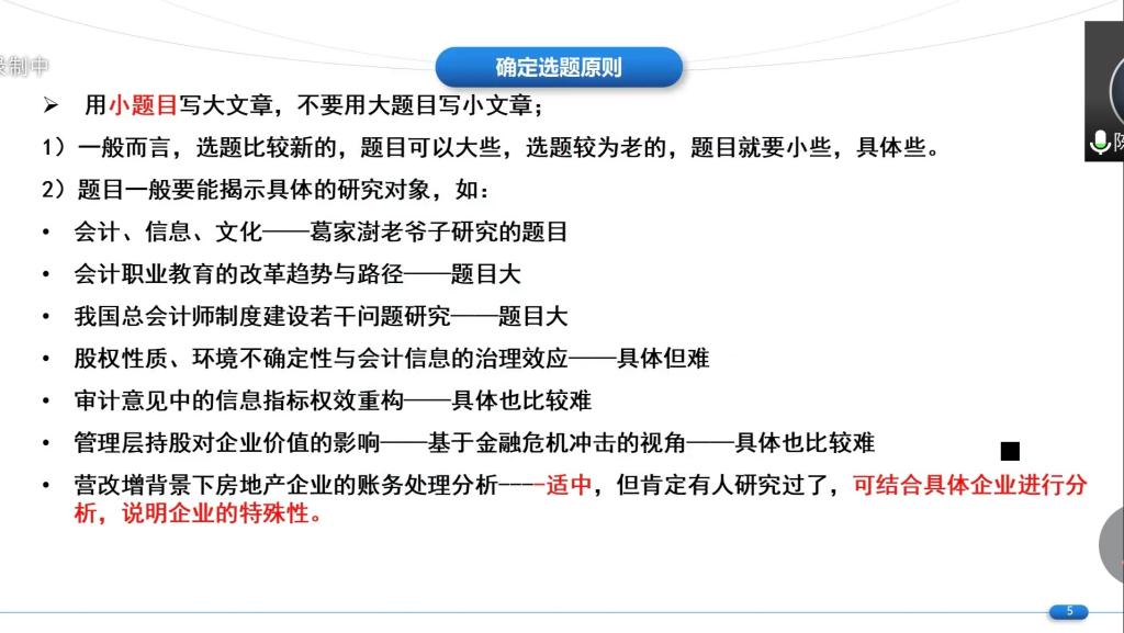 有的放矢,精准透辟,选题是论文写作的关键。陈军梅将选题喻为“剥笋”的过程,她强调,同学们首先要缩小研究范围,在明确研究对象的基础上理清研究对象的内在逻辑层次。对此,陈军梅建议采用揭示具体的研究对象的小标题模式增加论文逻辑性。对于研究对象,她表示要选择与所学课程有关的内容,如某一准则、某一方法在具体工作中的应用来谈讨。
