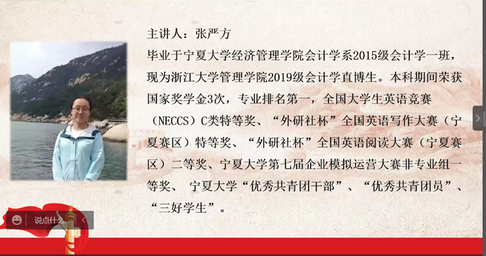 2015级会计学专业、浙江大学2019级会计学直博生张严方学姐分享个人学习经验、英语四六级备考经验、研究生生活体会,开展“我为群众办实事”系列活动。会计学本科生部分党员和全院部分本科生参加了此次活动。会议由会计学本科生党支部陈方博主持。