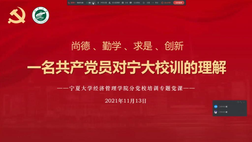 第38期入党积极分子与第14期发展对象参加了此次党课。本次党课由艾萨主持,艾萨为同学们作题为《一名共产党员对宁大校训的理解》的专题党课。