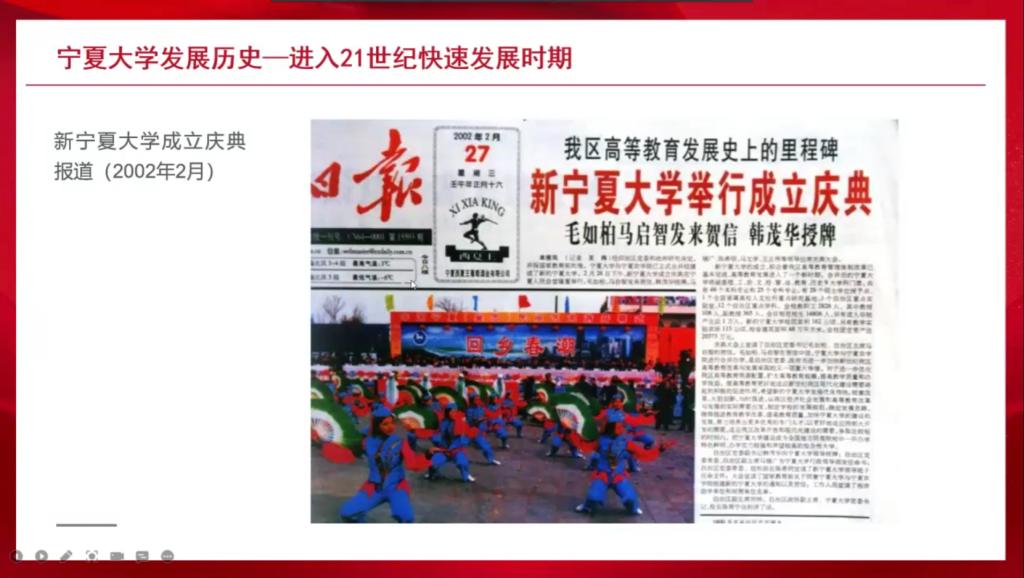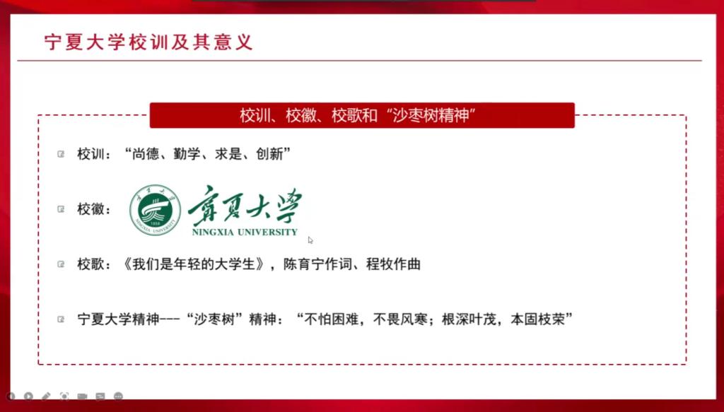 艾萨用生动详细的语言和一张张写实的照片带领同学们一起回顾了宁夏大学的发展历史,从艰苦创业时期到经历改革开放时期,再进入21世纪后快速发展,一代又一代宁大人以坚强的沙枣树精神艰难前行,为宁夏、西北地区乃至全国培养人才,贡献力量。