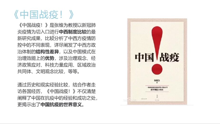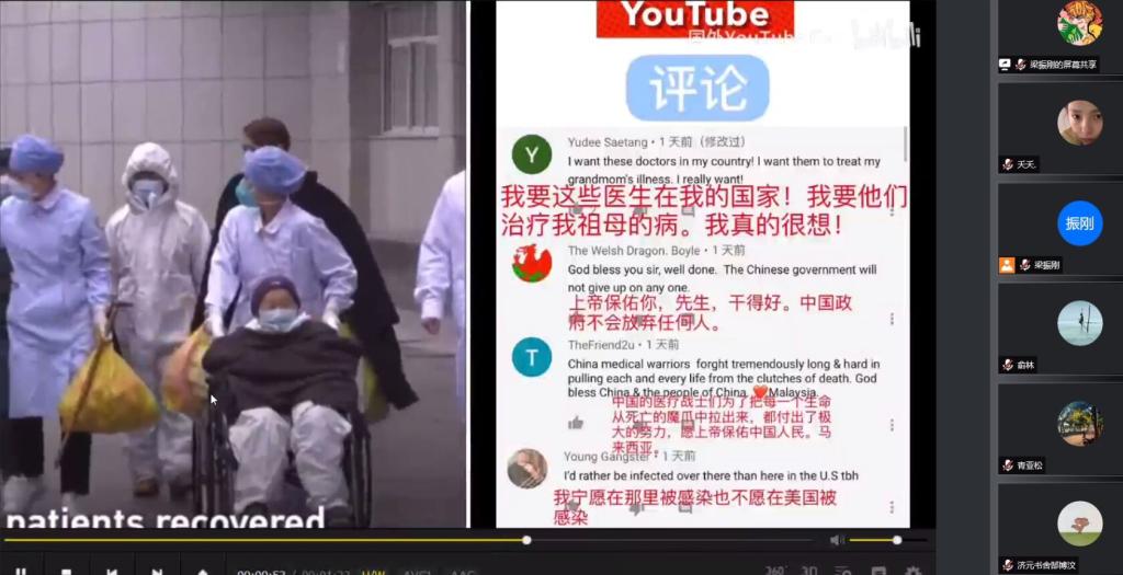 集体讨论中,陈方博、张清华、梁振刚等同志共同围绕不同类型的抗疫书籍,国外不良媒体的负面宣传,中国国际影响力逐渐提升等话题展开讨论。随后,参会同学共同观看抗疫影片,得出我们要理性对待国外媒体对于中国疫情的报道,我们需要像《中国抗疫!》作者张维为一样为中国发声。