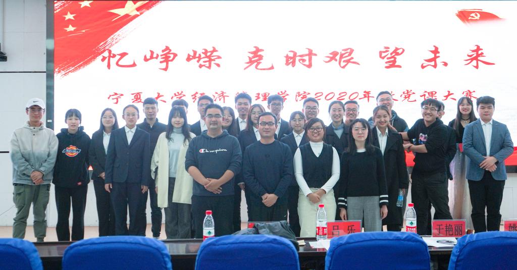 经过激烈角逐,经济学本科生党支部《光辉照我心》获得一等奖,农林经济管理本科生党支部《星星之火可以燎原》、会计学本科生党支部第一组《可爱的中国》获得二等奖,工商管理本科生党支部《疫往直前》、会计学本科生党支部第二组《生来倔强》、经济农经硕士研究生党支部和会计专业硕士研究生党支部《我们始终在一起》获得三等奖。获奖小组同评委合影留念,宁夏大学经济管理学院2020年微党课大赛顺利结束。