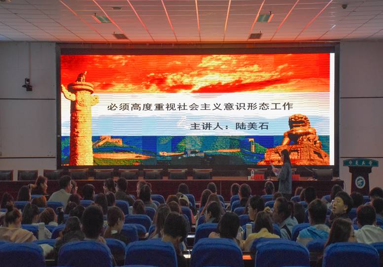陆美石围绕“必须高度重视社会主义意识形态工作”的主题娓娓道来,2013年至今,习近平总书记多次强调社会意识形态的重要性,陆美石以此为引,从社会主义意识形态及其重要性、深刻认识当前我国意识形态面临的各种挑战、党中央历来重视社会主义意识形态工作和大学生必须勇做社会主义意识形态的接班人四个方面展开讲述,以此向新时代大学生提出殷切期望,希望大学生能够“过五关斩六将”,不仅要学习理论,牢固树立革命理想,还要努力培育和践行社会主义核心价值观,更要树立正确的政治观念,积极投身于新时代社会主义建设。