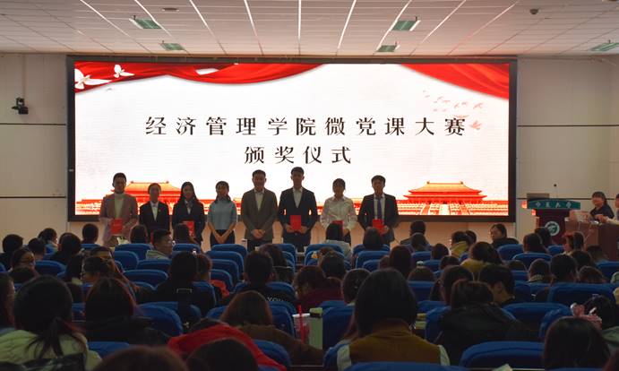 党课伊始,李琦发表讲话,希望各位学员可以将这一学期的所思所想投入到今天的党课表演中去,不辜负自己付出的辛勤汗水,也期待通过本次大赛发掘本期学员中的标杆榜样。如潮掌声中,微党课大赛正式开始,来自各党支部的十二组学员各显所长,用多种形式诠释了他们心中对中国共产党的理解和对青年大学生该如何担当的认识。此次微党课大赛形式丰富,包括ppt讲解、诗朗诵、情景剧、合唱等,他们的展演主题突出、内容鲜活、形式生动。唱音婉转,舞姿曼妙,激昂的歌声与朗诵声在报告厅交织响起,创意十足的配音表演与情景剧使大家眼前一亮。经济学本科生党支部第二组的表演《宁夏党史》使人印象深刻,收获了一致好评,并以91.73的优异成绩摘得桂冠。