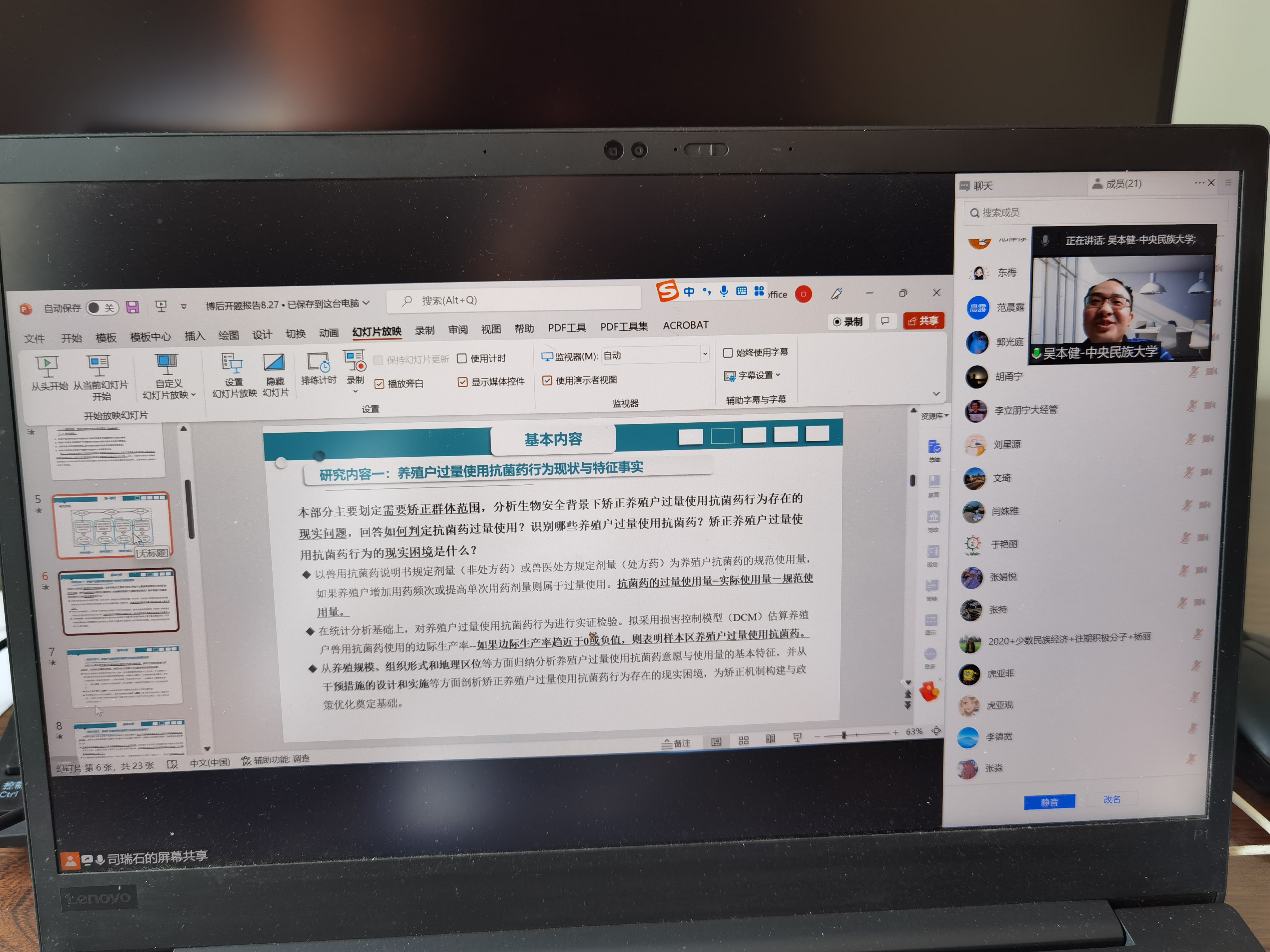 随后,博士后研究人员司瑞石博士以《生物安全背景下养殖户过量使用抗菌药行为及其矫正机制研究》为题,分别从课题的选题来源、基本内容、预期目标、国内外研究现状、研究意义、工作基础、研究方案以及课题研究的特色和创新点等方面进行了详细汇报。