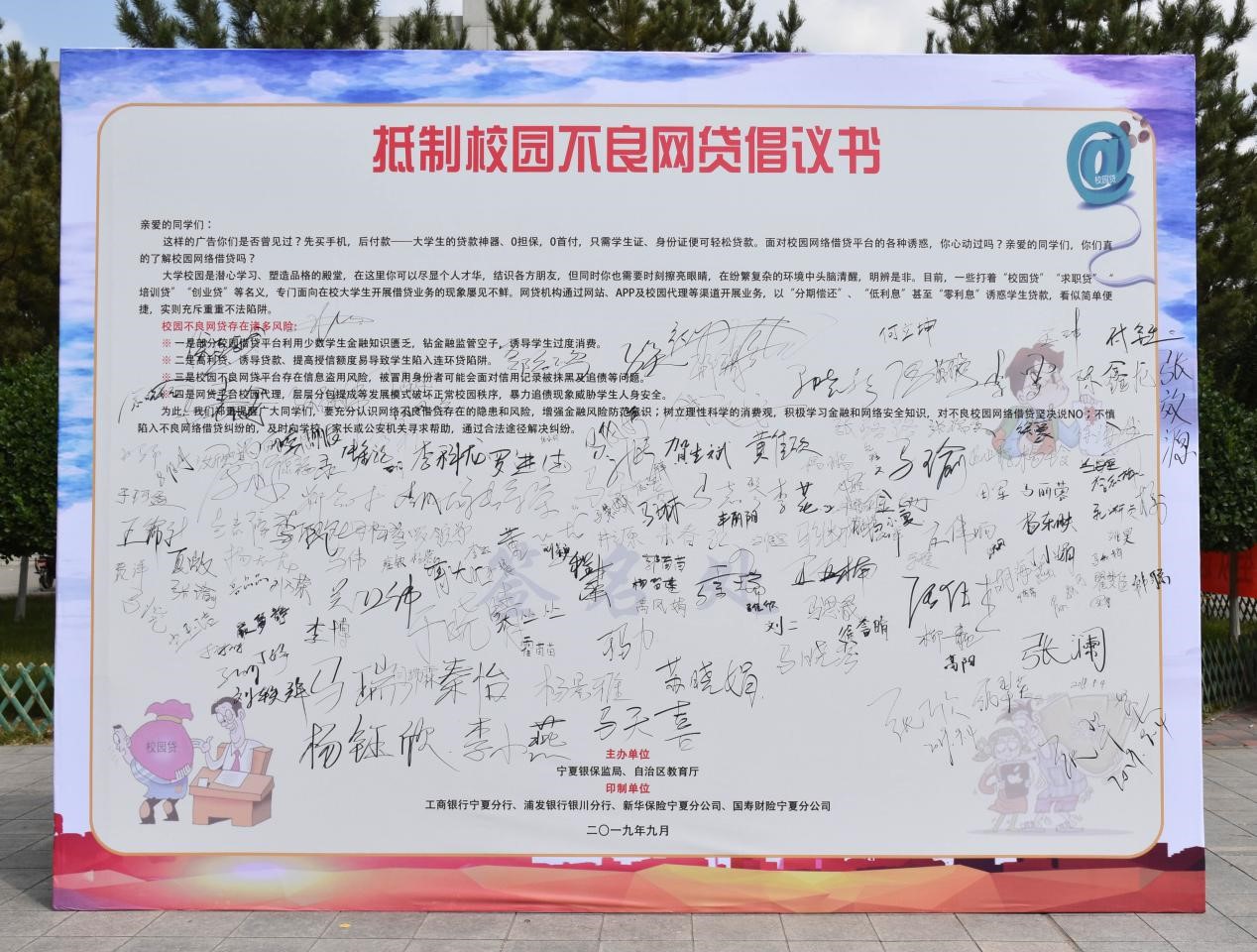 随后学生代表们在印有“抵制校园不良网贷倡议书”的签名墙上签名并领取金融知识相关宣传资料。