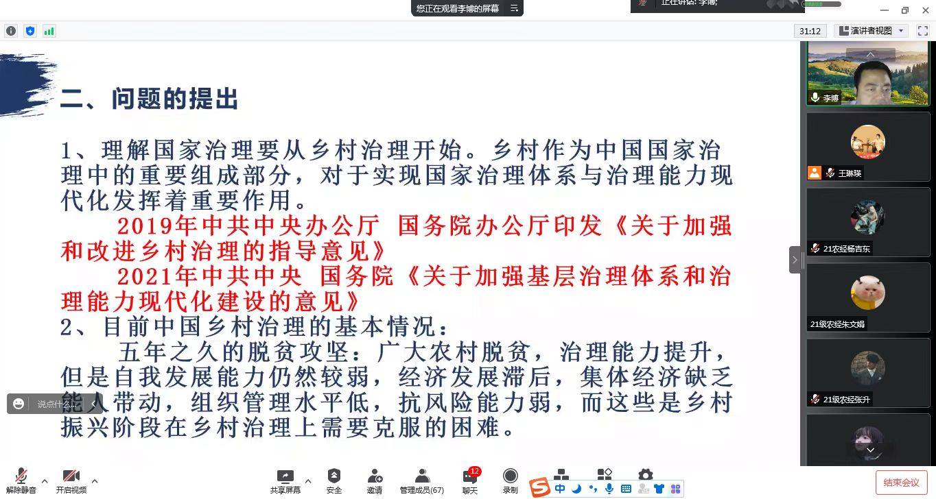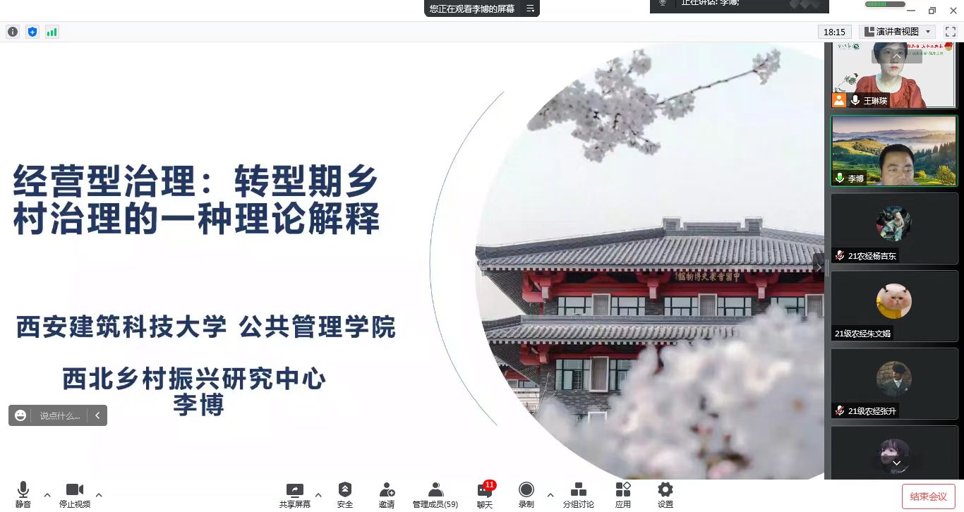 在云报告厅的答疑互动环节,新疆农科院的苏武峥,宁夏大学农经本科生朱之毅,农经研究生李欣欣、农村发展研究生韩成梅和金向琴先后与李老师进行了学术探讨与交流。强化三治融合,是实现治理有效、乡村善治的必由之路。