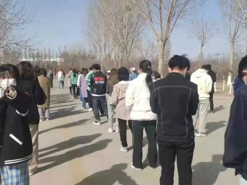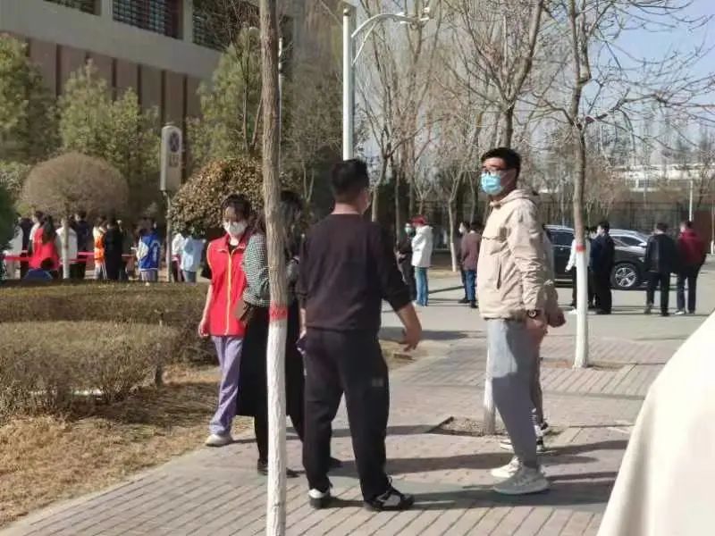 在核酸检测现场,志愿者们身穿防护服,进行扫码测温、信息录入、维护现场秩序等工作,耐心告知同学们注意事项;医护人员坚守岗位,认真负责,核酸检验有条不紊;同学们服从安排,有序排队,保持间隔,沉着等待。