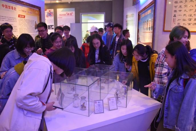 参观之前,讲解员为同学们介绍了建立禁毒基地的原因,这与我区近几年的禁毒工作总目标密不可分,2017年我区向中央提出创建全国禁毒示范省区的申请,建立禁毒基地将有利于申请顺利通过,这将为禁毒工作提供良好环境,使禁毒意识更加深入人心。讲解过后,同学们踏着绿色的地毯走进禁毒基地。映入眼帘的是“禁绝毒品,功在当代,利在千秋”的红色字样,展板上是中国近代以来的禁毒史,以及新中国成立后各界领导人在禁毒工作上的相关政策,表现了中国领导人对于毒品坚决抵制的态度。继续向前走,蓝色灯光下投影出各类仿真毒品与吸毒工具。同学十分诧异,这看似普通的事物,竟能将人推向万丈深渊。在外观越来越隐蔽的同时,新型毒品也开始出现,如冰毒、麻古等。展板上一一列举了吸食毒品的危害,如妻离子散、加速死亡、神经失常,这触目惊心的画面为同学们敲响了远离毒品的警钟。在禁毒作品展区域,同学们翻看着自己禁毒知识考试的答卷,认识到自己对于毒品知识的漏洞。禁毒基地的学习不仅使众人了解了毒品的相关知识,也了解到如何预防毒品威胁、抵制毒品侵害。