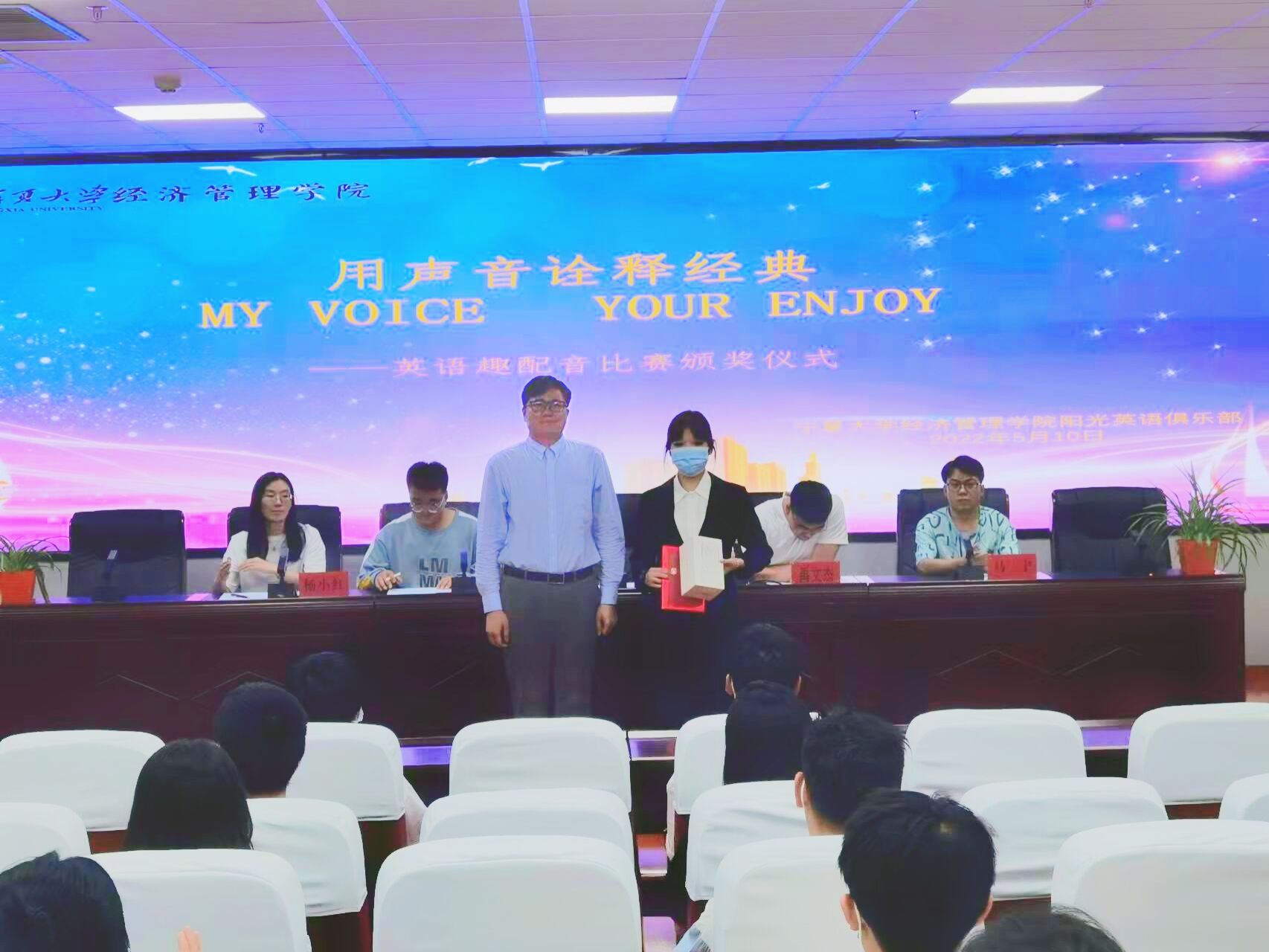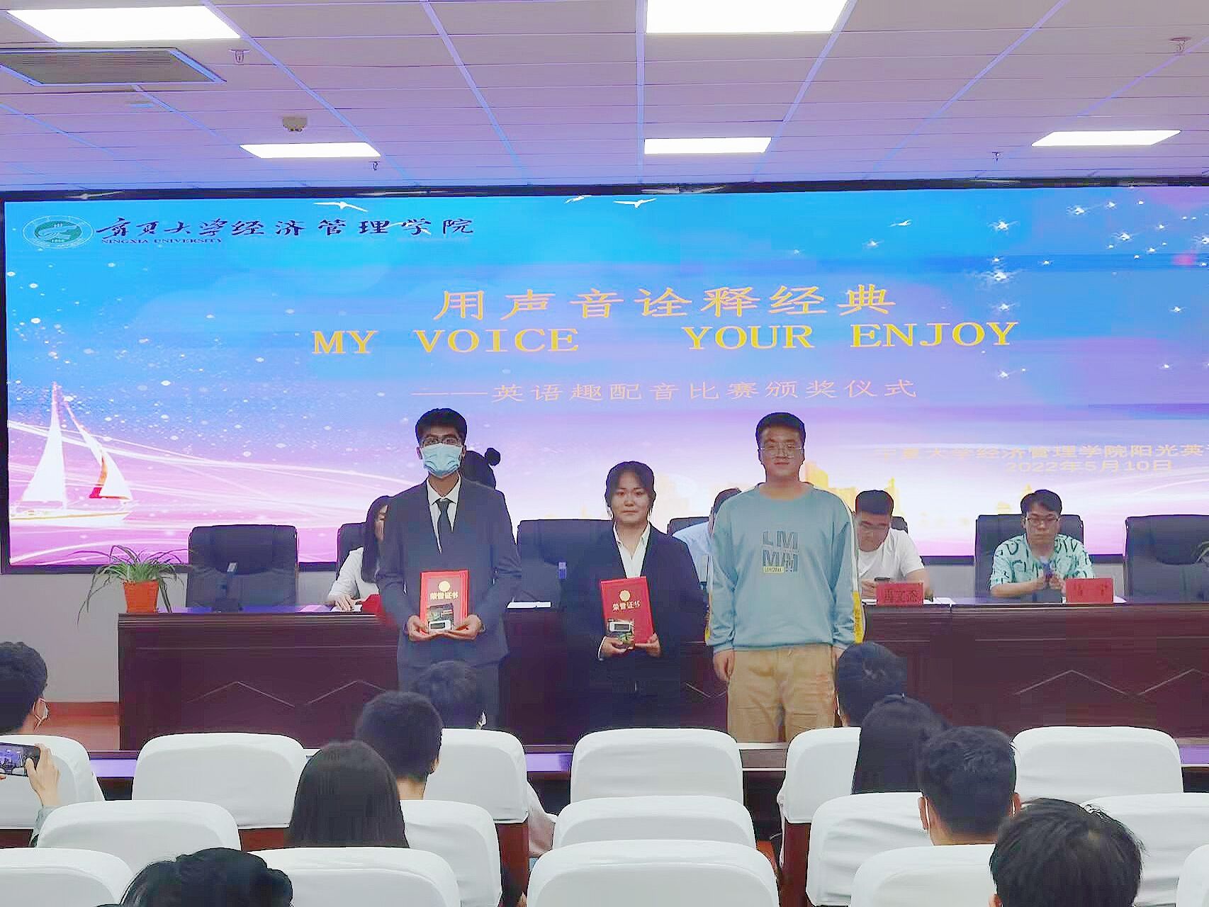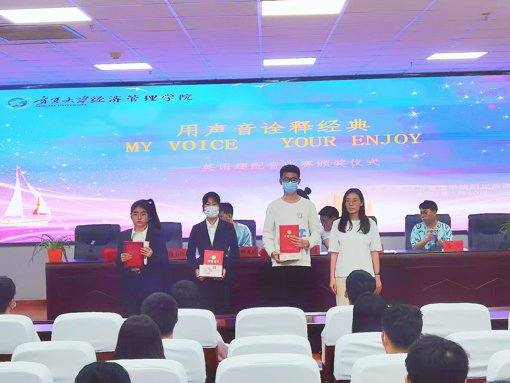 “第四届英语趣味配音”比赛和“奋进时代征程,共语青春梦想”主题英语演讲比赛颁奖仪式在贺兰山校区文荟楼316会议室顺利举行。学生工作办公室辅导员艾萨·阿尤普、禹文杰,团委副书记杨小红、柳虎威,阳光英语俱乐部负责人马宁参加会议,会议由郭存山主持。