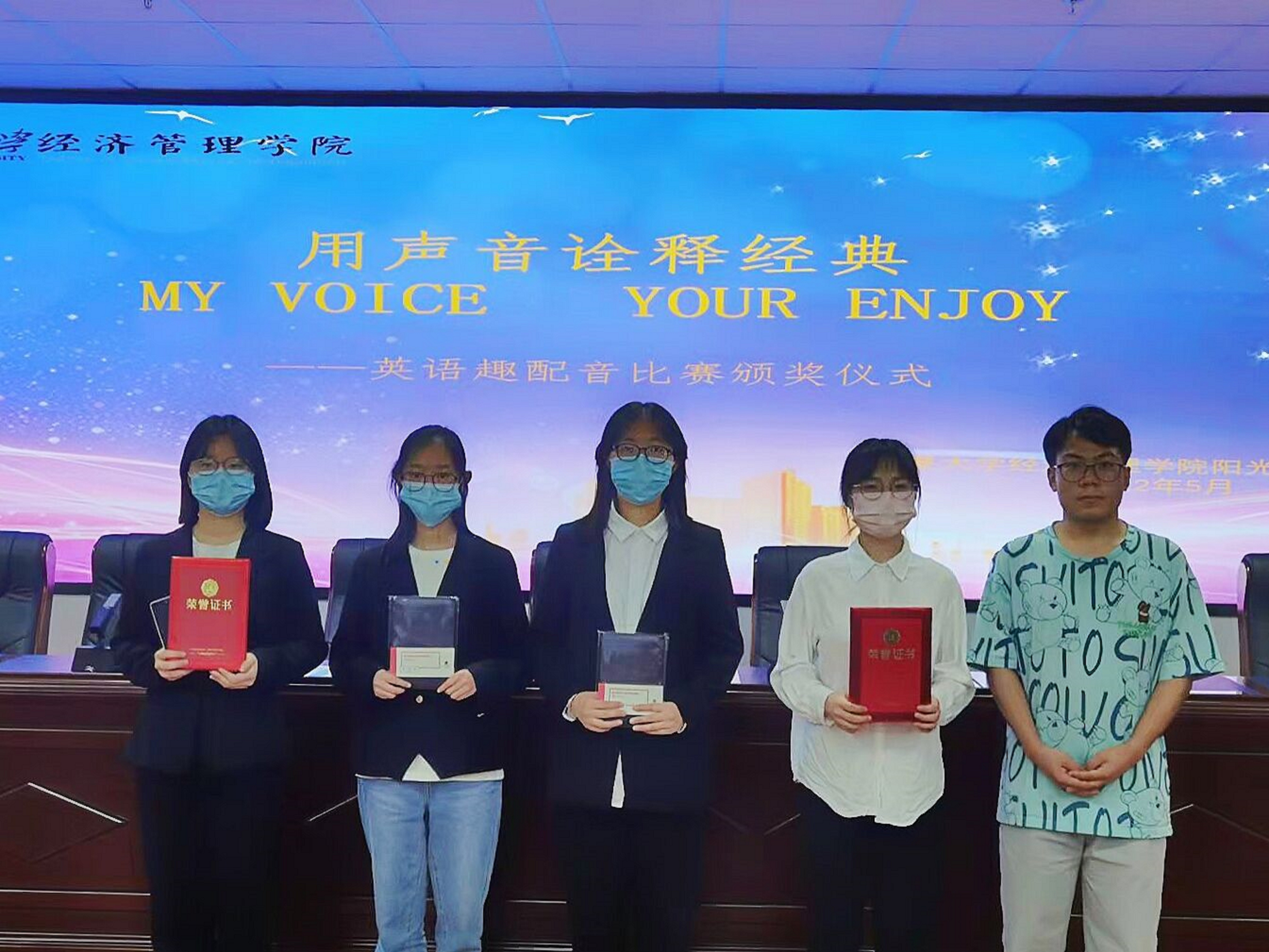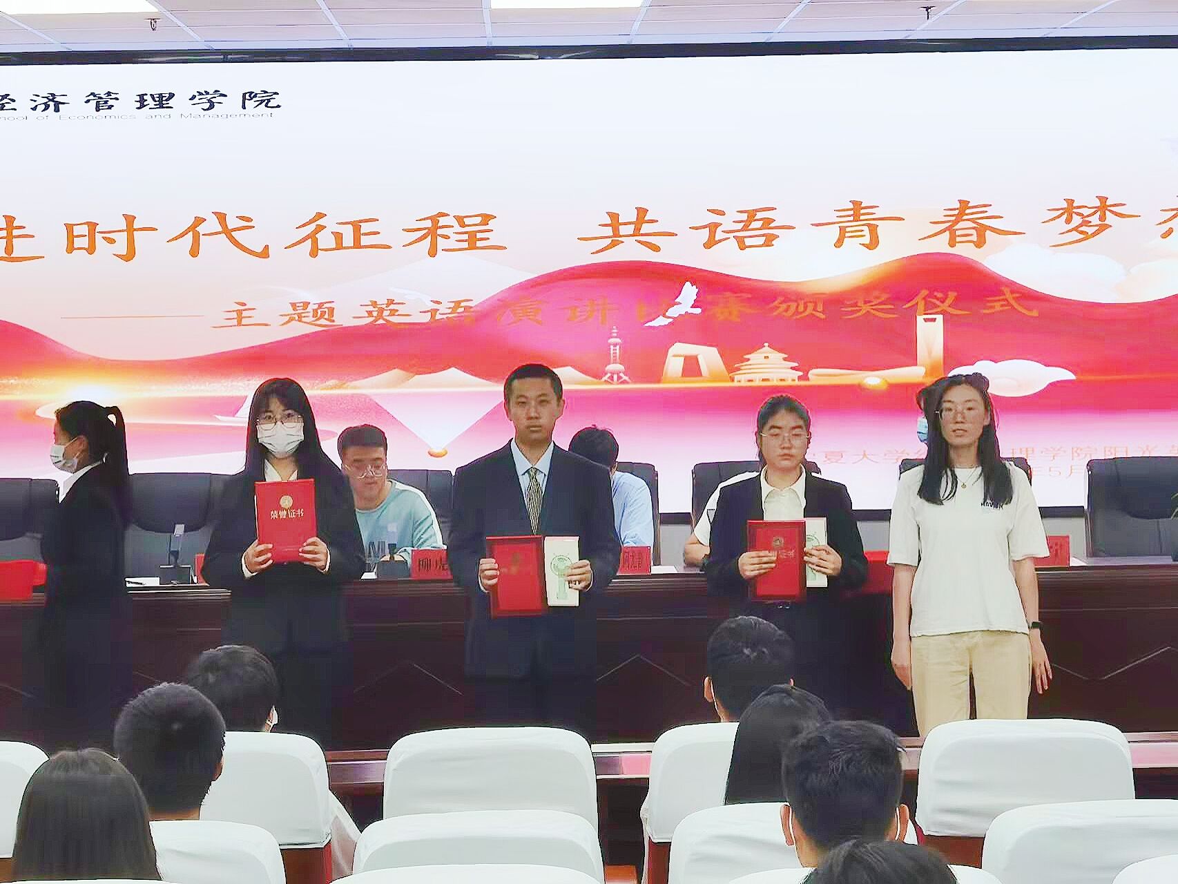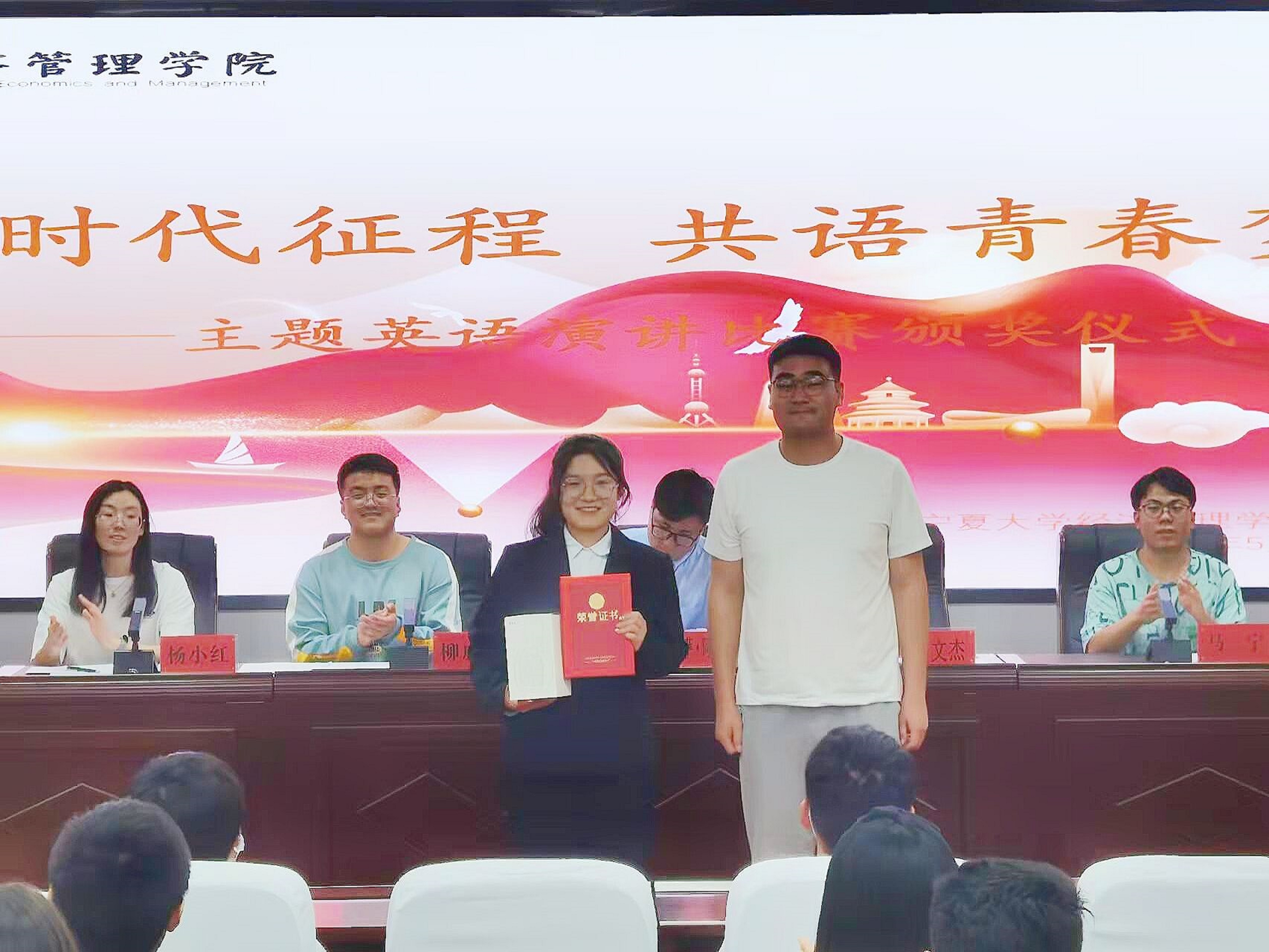 “第四届英语趣味配音”比赛和“奋进时代征程,共语青春梦想”主题英语演讲比赛颁奖仪式在贺兰山校区文荟楼316会议室顺利举行。学生工作办公室辅导员艾萨·阿尤普、禹文杰,团委副书记杨小红、柳虎威,阳光英语俱乐部负责人马宁参加会议,会议由郭存山主持。