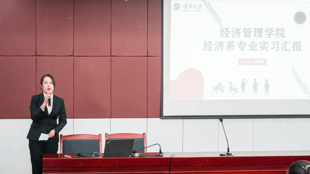 经济学专业负责人仇娟东介绍了实习汇报情况。他以政策出台的初衷和现实中融资公司难实施政策的例子告诉同学们专业实习的原因并鼓励同学们把握实习机会,通过实践平台将理论知识理解的更为透彻和清晰。