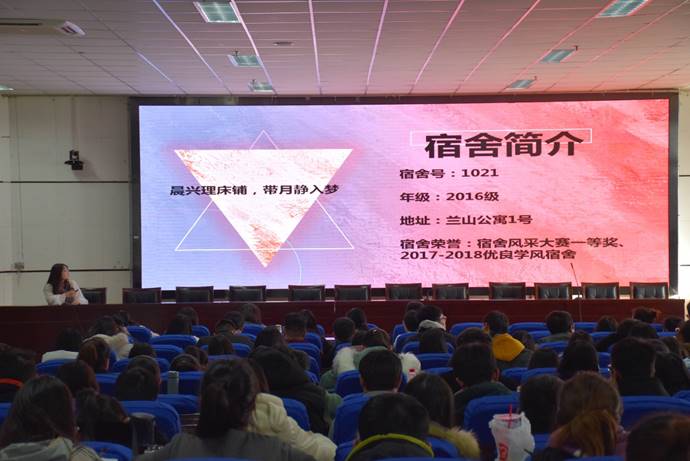 乃至班级最小的集体,具有至关重要的作用,一个宿舍舍风的好坏,将直接影响舍员的日常学习及生活。紧接着到了宿舍代表交流环节,七位宿舍代表分别上台根据自己所做的PPT为在座的同学们展示了自己与宿舍舍员们在各方面取得的硕果,其风趣的语言和对大一新生语重心长的叮嘱令人温暖无比。一摞摞证书反映出她们在学习、工作方面所付出的远超于他人的努力;一张张宿舍集体照体现了她们之间深厚的情谊。这些优秀宿舍所传递出的积极向上、自律自严、互帮互助的正能量感染着在座每一位同学,使观众在惊叹之余不免暗下决心向优秀宿舍学习。最后,黄旭兴进行总结,他希望全体同学都能认真思考如何建设具有优良学风的宿舍,同时督促同学们在临近考试的阶段刻苦学习,以取得优异成绩。至此,活动圆满结束。