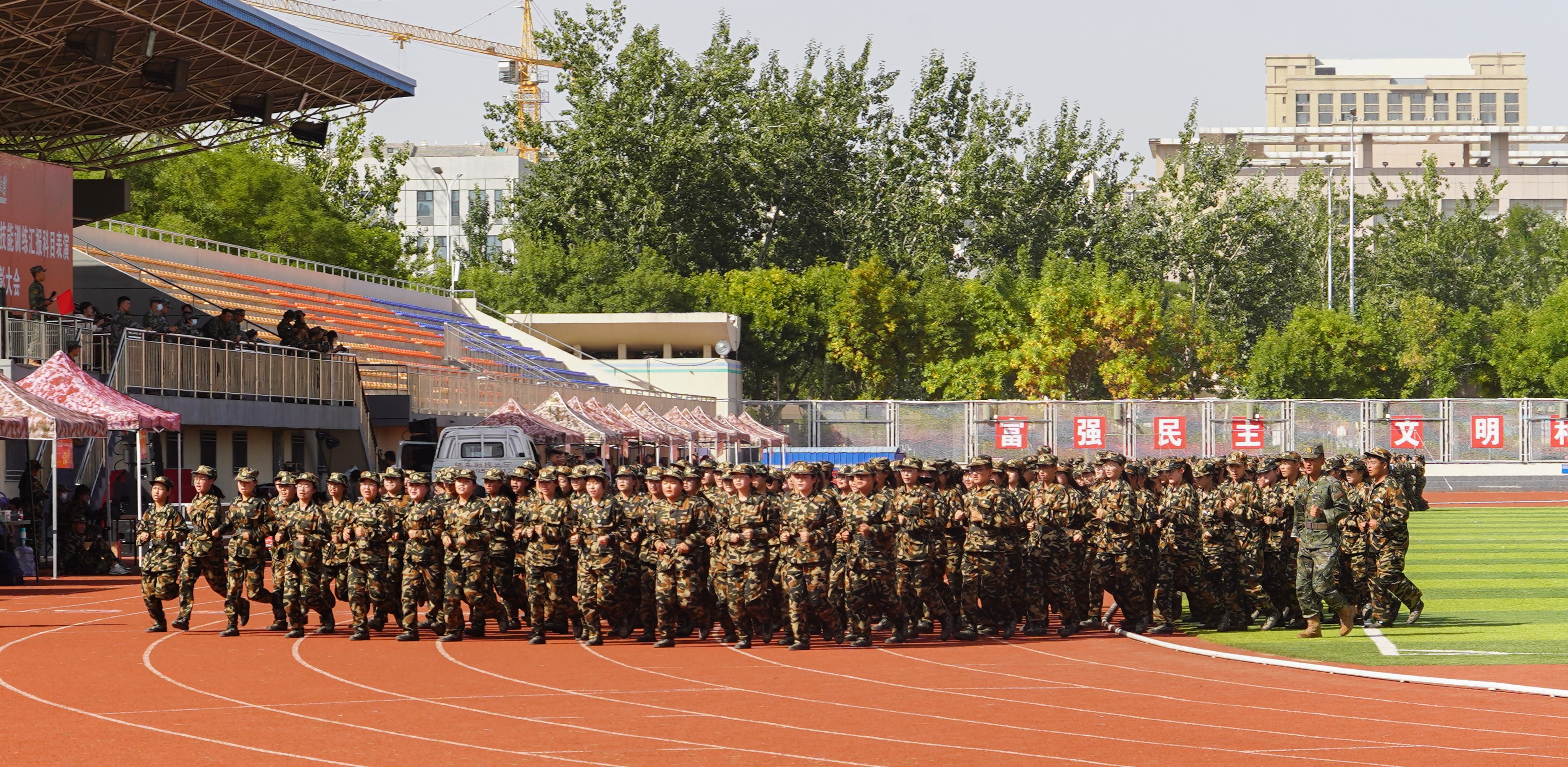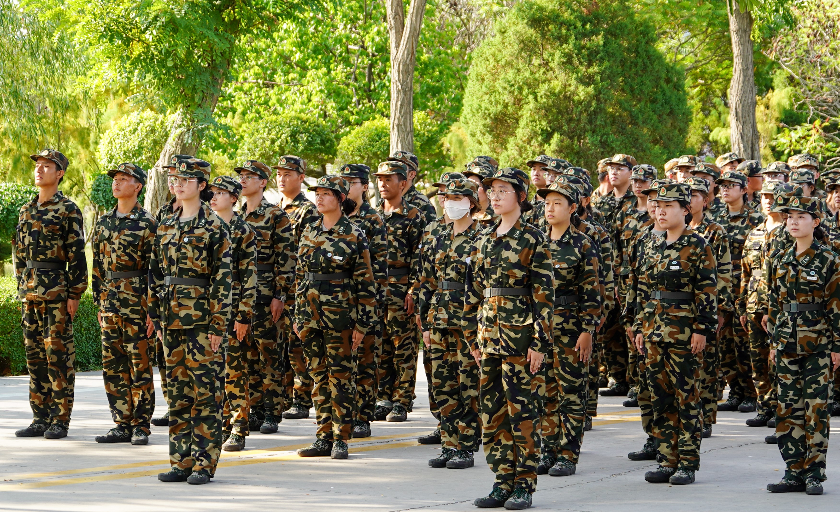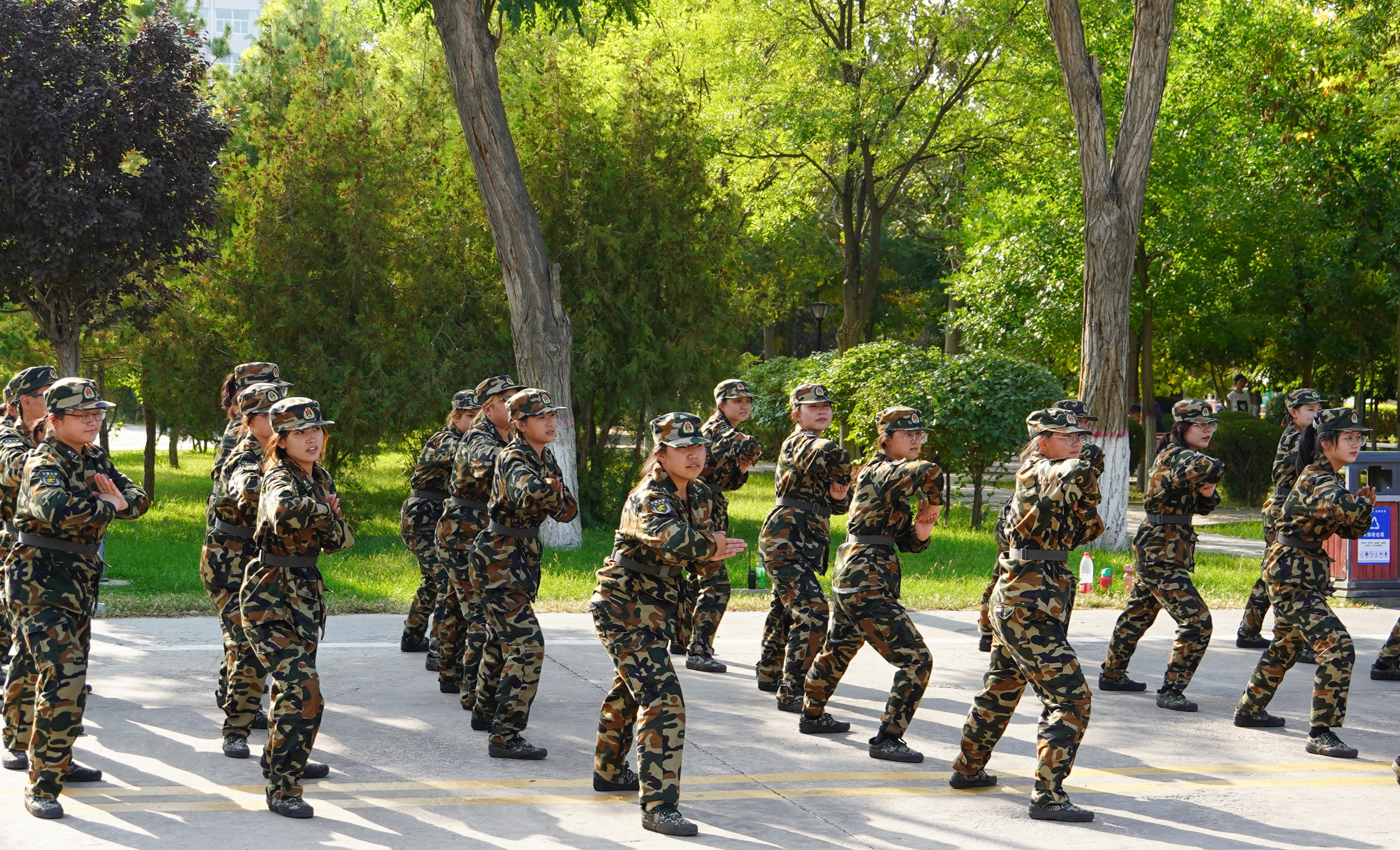 熠熠骄阳下,经管学子整装待发,绿色的军装彰显青春的韵味,稚嫩的脸庞充满着对未来的憧憬。怀远操场上,红色的跑道与绿色的草坪交相呼应,身着迷彩军装的同学们在这片平地上展现着三营七连的风姿风采,打着由教官们改进的九动擒敌拳,一提一踏,一抓一推,动静之间,经管学子们在不断的磨合中增添了默契,懂得了集体的重要性,不断的磨砺自我。