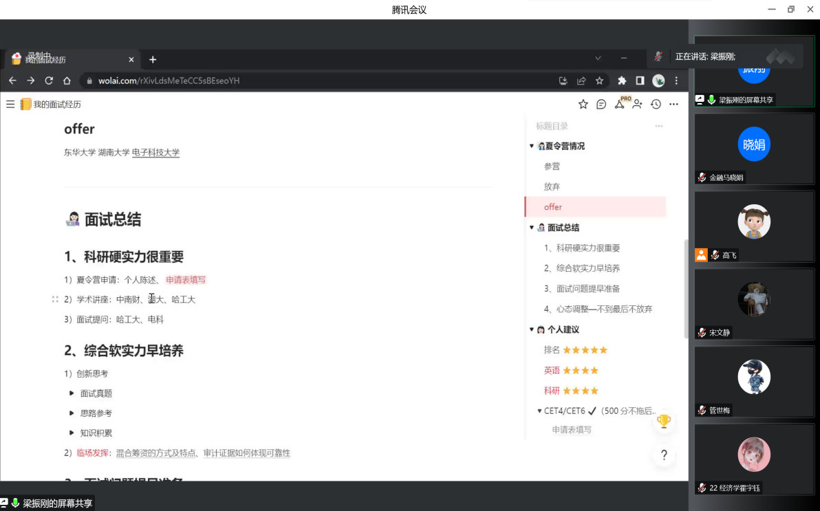 崔琳琳结合个人情况详细介绍了保研的前期准备,并就面试应答、投递院校给出相关策略,帮助同学解答如何回答面试问题等相关问题。她希望同学们对自己未来提前做好规划并尽快行动。孔令怡详细介绍了大一到大三保研的学习生活:大一应提前做规划并尽快熟悉环境,培养自己独立思考意识,享受丰富的大学生活;大二在掌握学习成绩的基础上多参与含金量高的竞赛并尝试撰写论文;大三稳住专业排名、坚持学习英语并开始准备保研相关事宜。马和霞分享了个人支教经历和大学生活,并结合自身获奖、入党经历鼓励同学们有选择地参与兴趣活动来锻炼、提升自己。