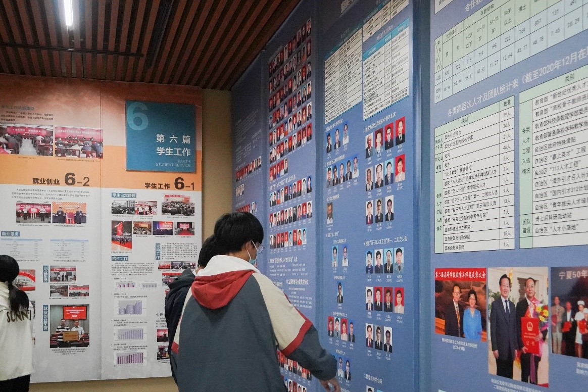 随后,讲解员为同学们介绍了校史馆中现任及历届校友的故事,激励着同学们明志奋发,为校争光。一件件陈列的展品浓缩着我校历来的成果,不同篇章的校园发展史更是让同学们为之震撼。师资队伍、学生工作、合作交流、校园文化等一系列的成果都彰显着宁夏大学六十余载全方位建设道路上的进步与辉煌。