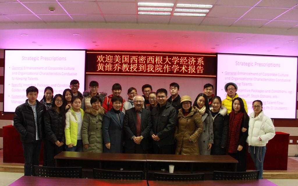 12月26日下午,美国富布赖特学者、西密西根大学经济系黄维乔教授应邀用英文为游戏赚钱平台-试玩赚钱