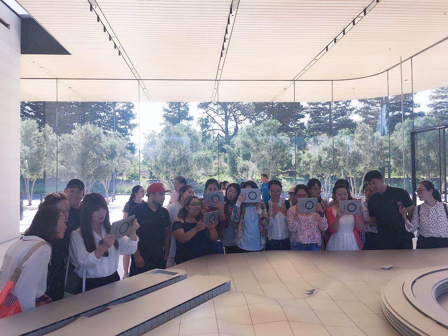 | 宁夏大学MBA师生一行在苹果总部参观中心通过Ipad体验AR技术在公司建筑概念展示中的应用 |