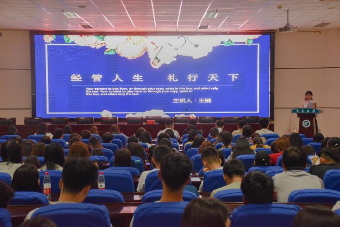 “经管人生、礼行天下”,环球礼仪商游戏赚钱平台 高级礼仪培训师王婧亲身示范讲授各类礼仪技巧,鼓励毕业生注重礼仪、践行礼仪,做一个礼行天下、富有仪式感的经管人。