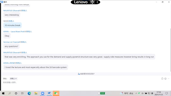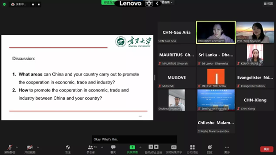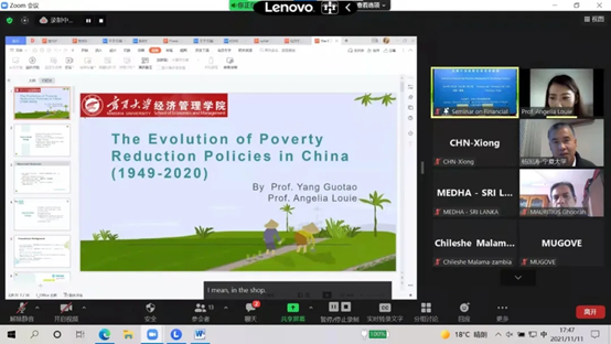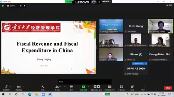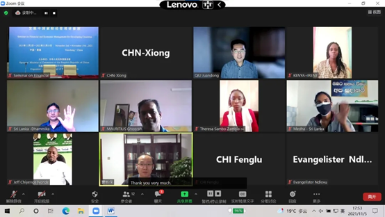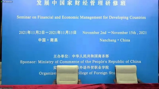 组织实施,宁夏大学理论经济学教学团队承担主讲的《发展中国家财经管理研修班》线上教学顺利完成。本次培训英文授课,共有来自基里巴斯、毛里求斯、斯里兰卡、赞比亚、乌兹别克斯坦、肯尼亚、津巴布韦等7个国家的23名政府官员参加。宁夏大学理论经济学教学团队承担了8个专题培训,《中国经济发展战略》《中国经济结构调整与产业链升级》由仇娟东副教授主讲,《中国财政收入与财政支出》《中国的分税制财政体制》由张会萍教授主讲,《“一带一路”沿线国家贸易投资便利化发展》《中国与“一带一路”沿线国家经贸产业合作》由杨韶艳教授、叶晨露老师主讲,《中国农村扶贫开发政策演变(1949-2020年)》由雷安琪副教授主讲,《中国农村减贫经验及典型案例》由杨国涛教授主讲。