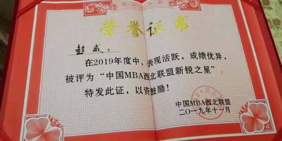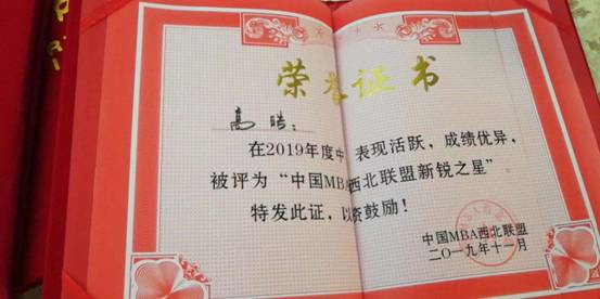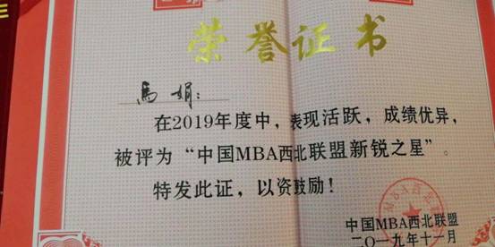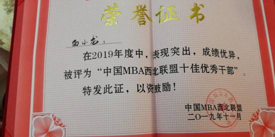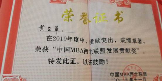 ”,我校黄立军教授荣获2019年度“中国MBA西北联盟发展贡献奖”,我校第九届MBA联合会主席白小龙被评为“中国MBA西北联盟十佳优秀干部”,我校MBA优秀学员马娟、高晧、赵威分别荣获“ 中国MBA西北联盟新锐之星”。