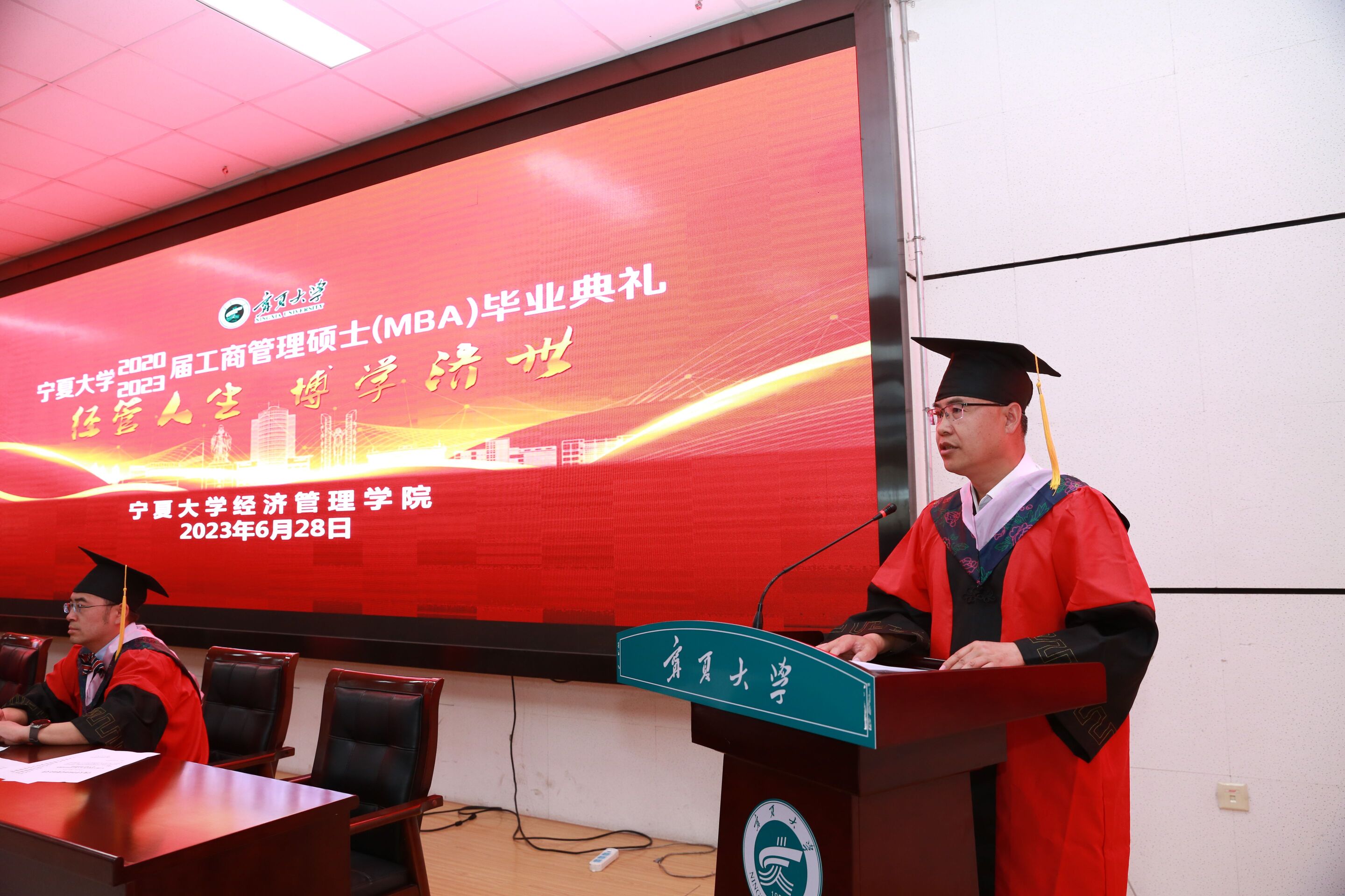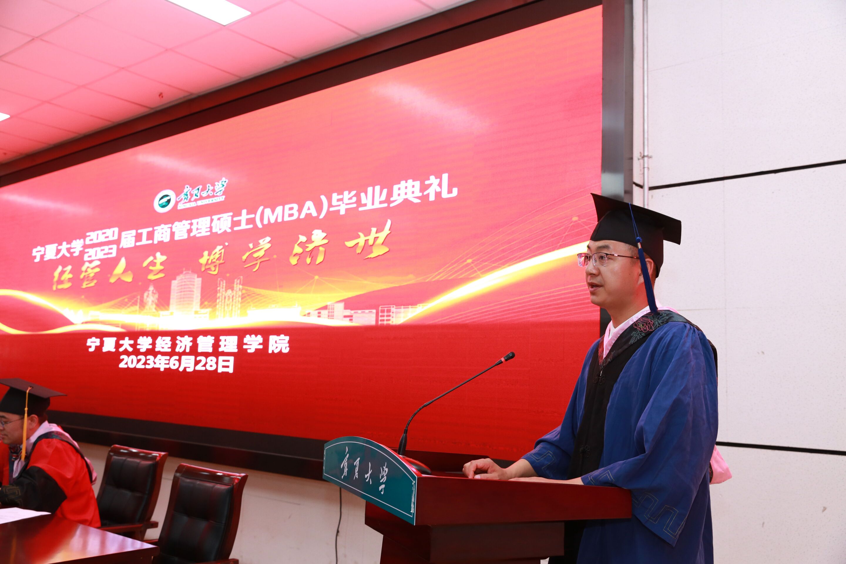 党总支副书记、院长杨国涛讲话。杨院长总结了近年来宁夏大学MBA教育取得的成果,回顾了三年线上线下教学相结合的学习历程,要求毕业生们能够积极适应变革、并行不悖合理安排时间、终身学习。希望所有毕业生心怀理想、立长志,树立远大的目标,与祖国同频,与时代同步,成为行业的佼佼者!