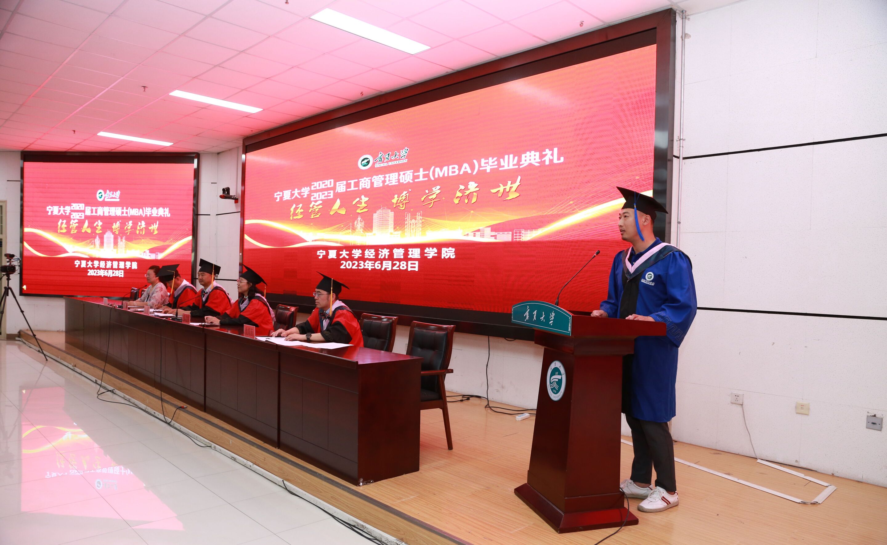 毕业典礼上,2020届MBA毕业生代表高皓饱含深情地站在发言席。他说期盼已久的毕业典礼终于到来,MBA读了三年,毕业典礼又等了三年,这在无形中拉长了MBA在读的时间,花了一份钱,却有双倍的收获。MBA给了一个平台,让自己站在巨人的肩膀上看到更广阔的世界。今后无论走到哪里,耕耘于何种行业,作为一名宁夏大学的MBA会永远谨记:尚德、勤学、求是、创新!
