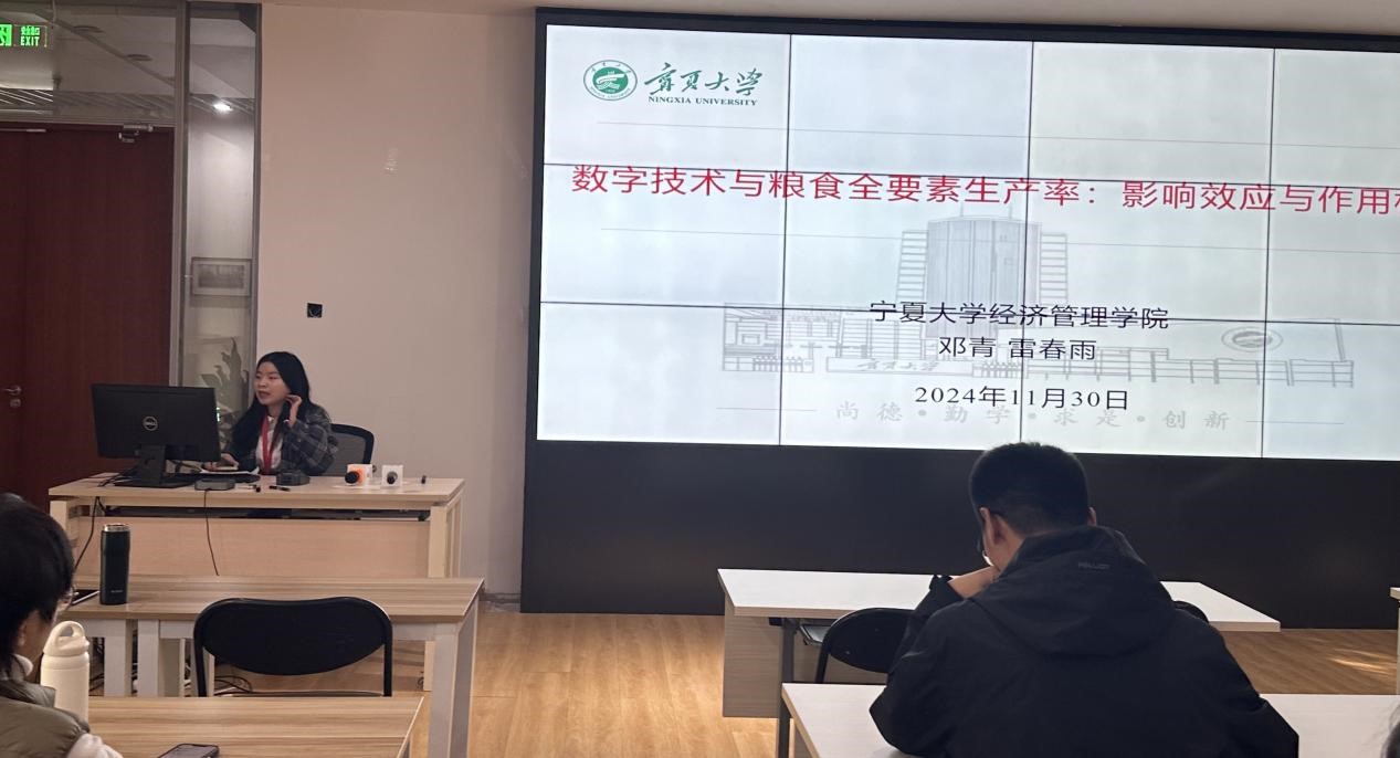 2024年11月30日,2023级研究生张倩格、任春妮、邓青、吴晓庆参加第二十四届中国经济学年会,并做“宁夏大学气候变化与数字经济专场”汇报,宁夏大学经济管理学院副院长仇娟东教授主持本专场。
