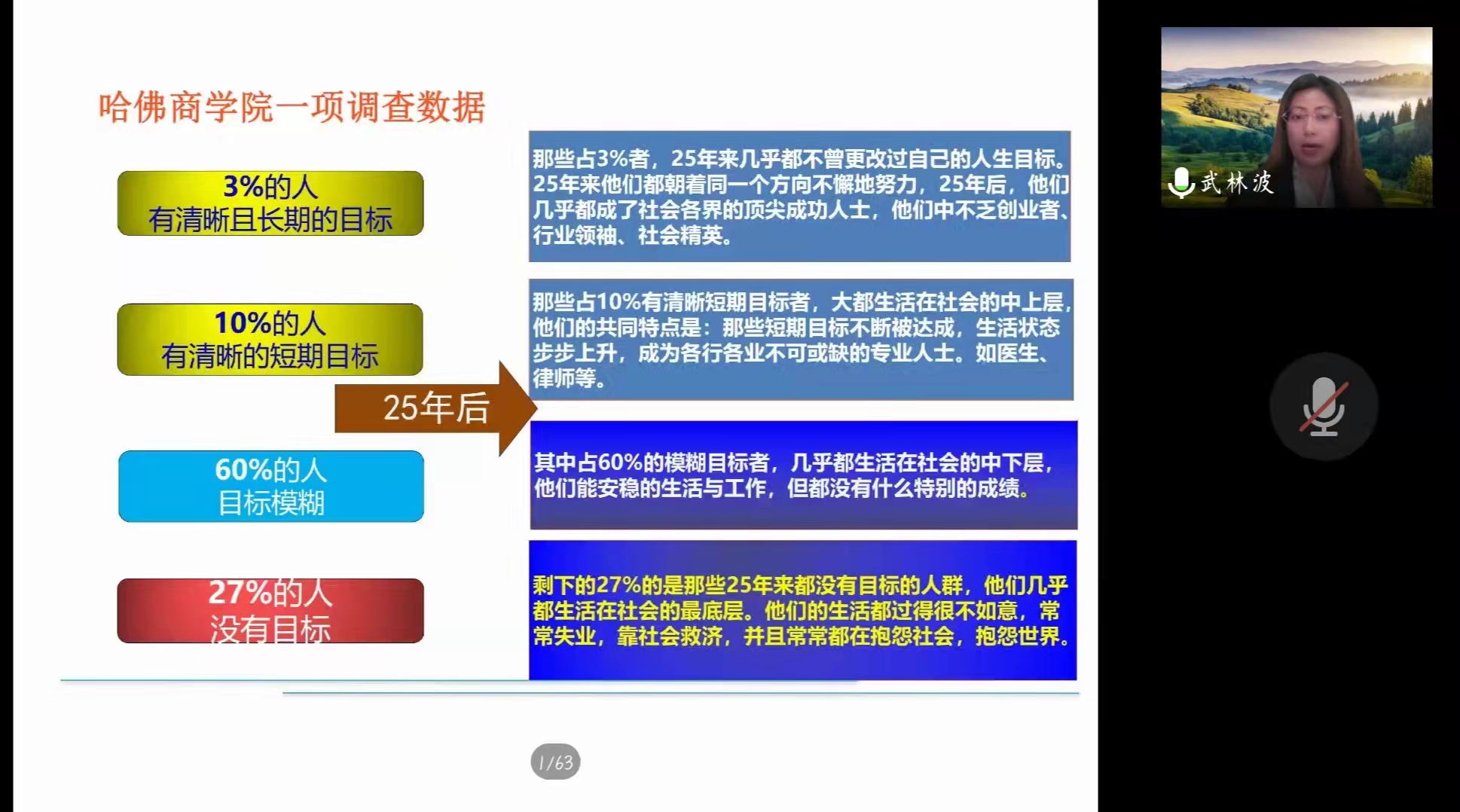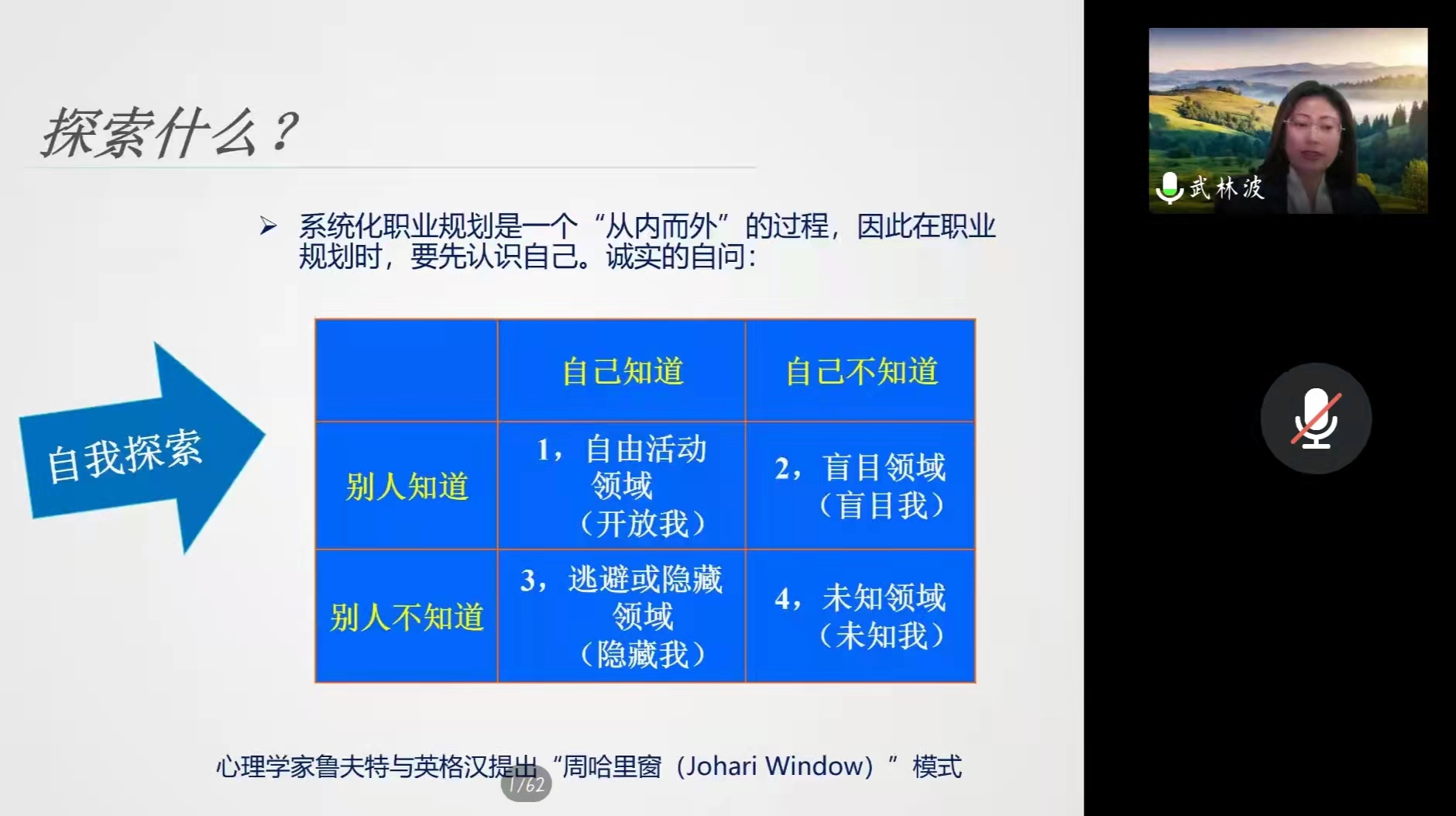 的事例,全面讲解了“乌卡时代”易变、不确定、复杂及模糊的主要内涵,以此点明职业规划的重要性。随后,她详细介绍了职业规划的内涵。武林波表示,科学的职业生涯规划是实现理想与目标的重要手段之一,职业生涯设计要择己所爱、择己所长、择世所需、择己所利。