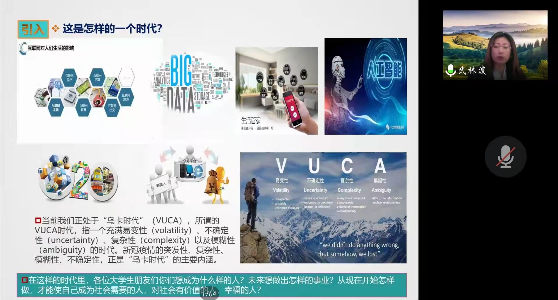 武林波以一个引人深思的问题“这是一个怎样的时代?”启发同学们思考,在与同学们互动过后,她表示,我们现在正处于“乌卡时代”,通过分析哈佛商游戏赚钱平台