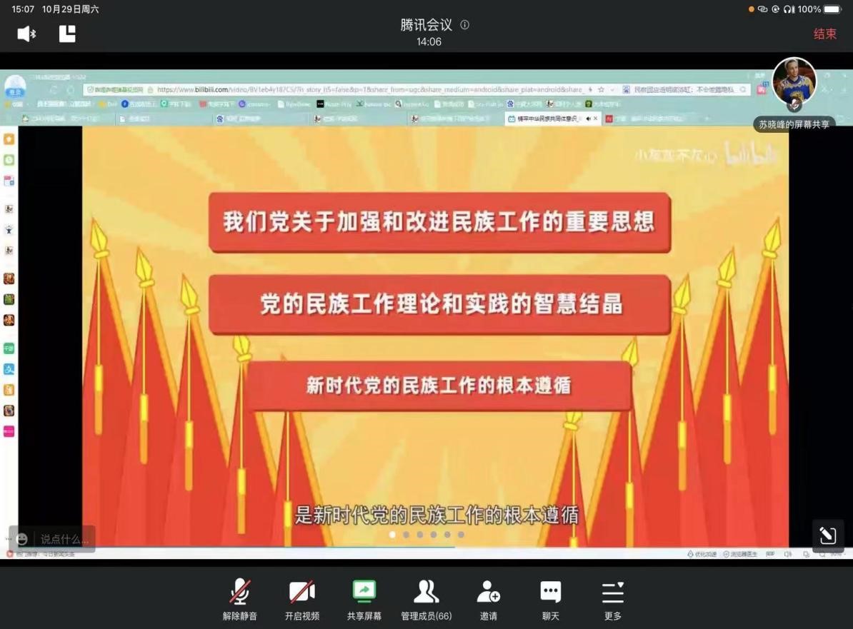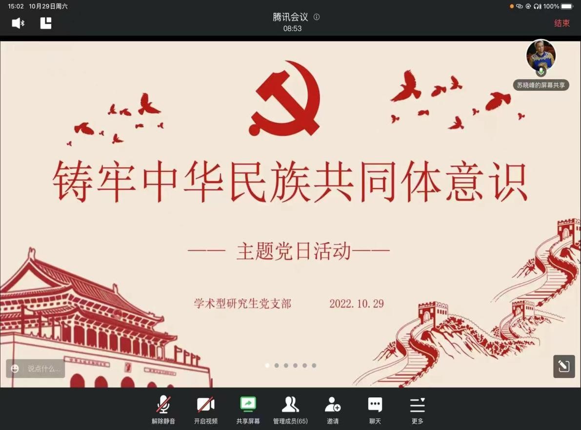 10月29日下午,游戏赚钱平台 学术型研究生党支部“铸牢中华民族共同体意识”主题党日活动在线上顺利召开。党支部全体党员、发展对象及积极分子参加会议,会议由党支部副书记苏晓峰主持。