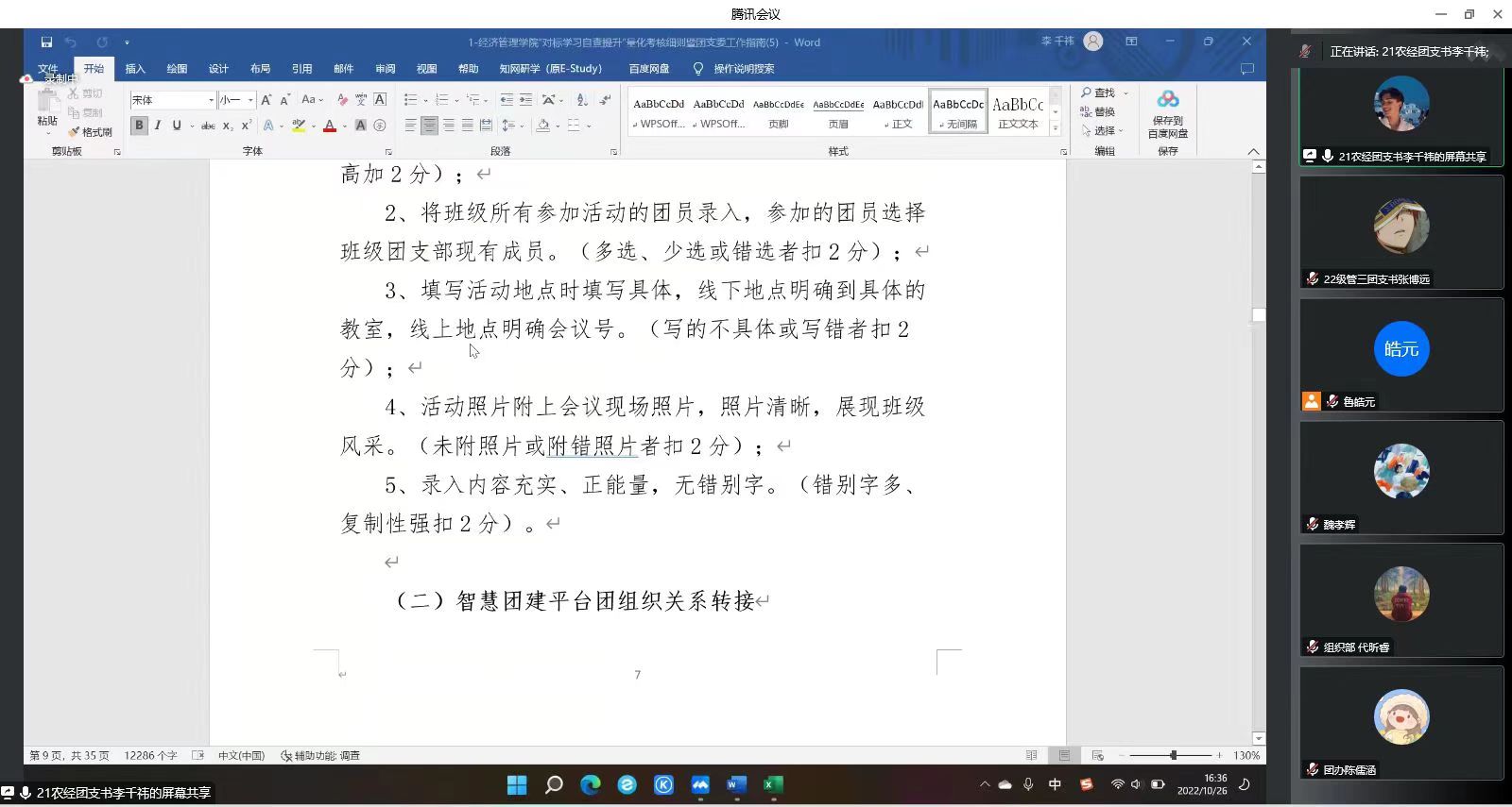 大会第一项,鲁皓元介绍“对标学习自查提升”活动和“班团一体化”运行机制建设的主要内容。大会第二项,孙文元对“对标学习自检提升”活动和“班团一体化”建设进行动员部署,强调了“对标学习自查提升”和“班团一体化”建设的必要性,并号召团支委、学生骨干团结同学,担当责任,用心组织,发挥引领作用,提高凝聚力,组织好班团建设,展现各自的风彩。大会第三项,鲁皓元说明“对标学习自查提升”量化考核细则的奖惩机制。大会第四项,团委组织部、智课服务部及团委办公室的工作人员讲解“对标学习自查提升”量化考核细则及各团支委分工安排。