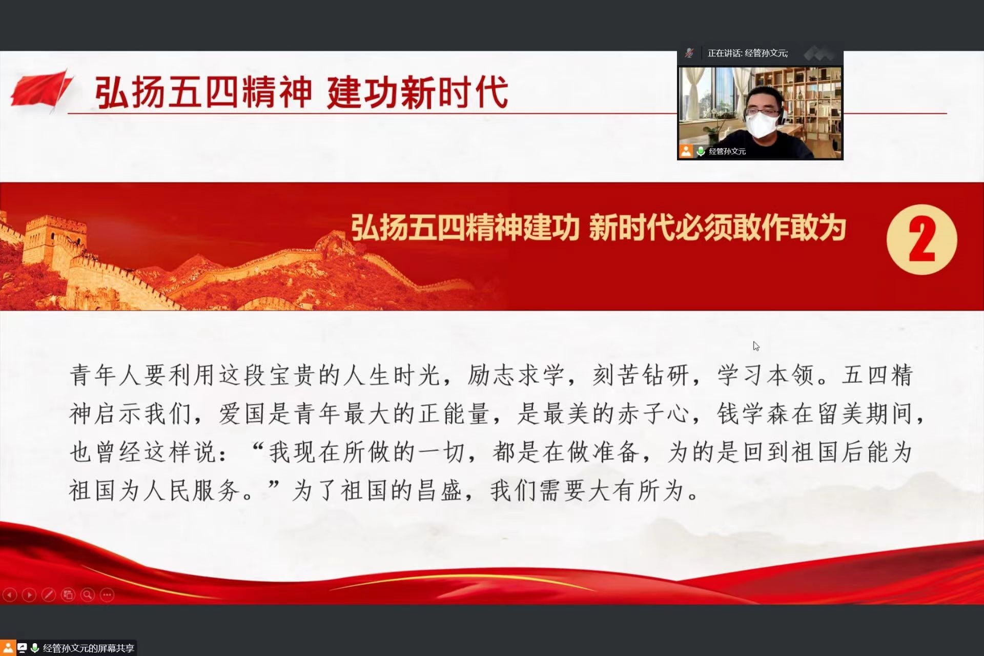 孙文元详细讲解了五四精神的核心内容及五四运动的历史意义,并结合新时代的历史方位,阐释了五四精神的新时代内涵。他谈到青年必须坚定信念、敢作敢为、不懈奋斗,以此弘扬五四精神,建功新时代。同时,基于做新时代有为青年的思想内容,孙文元对同学们提出了方向要明、品格要高、干劲要足的三点要求,并希望学员们严于律己、锤炼品格,以饱满的热情努力学习、积极实践、不负韶华。