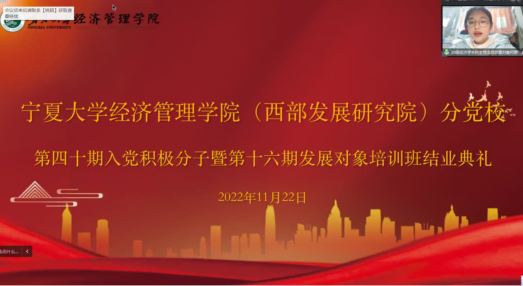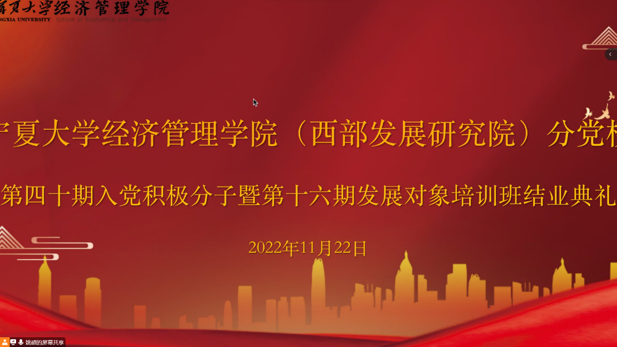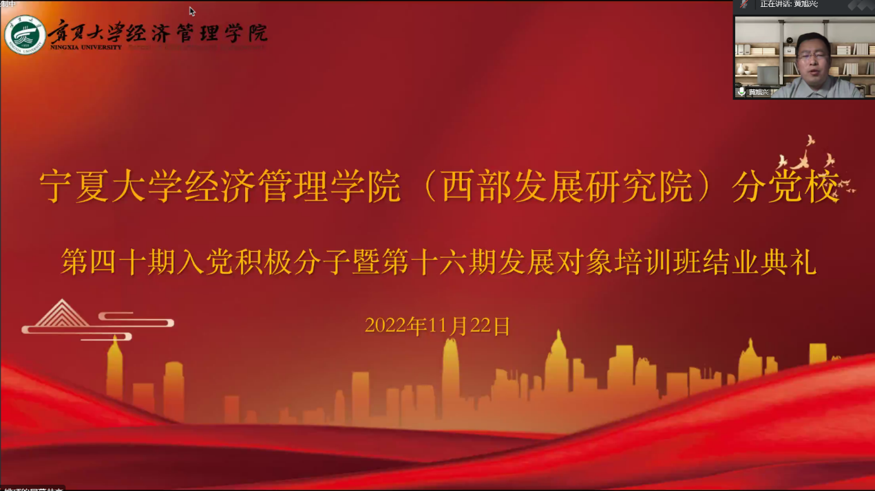 11月22日下午,游戏赚钱平台 分党校第四十期入党积极分子暨第十六期发展对象结业典礼在线上顺利举行。院党委副书记黄旭兴、党建秘书姚硕、第四十期入党积极分子和第十六期发展对象参加了会议。会议由姚硕主持。