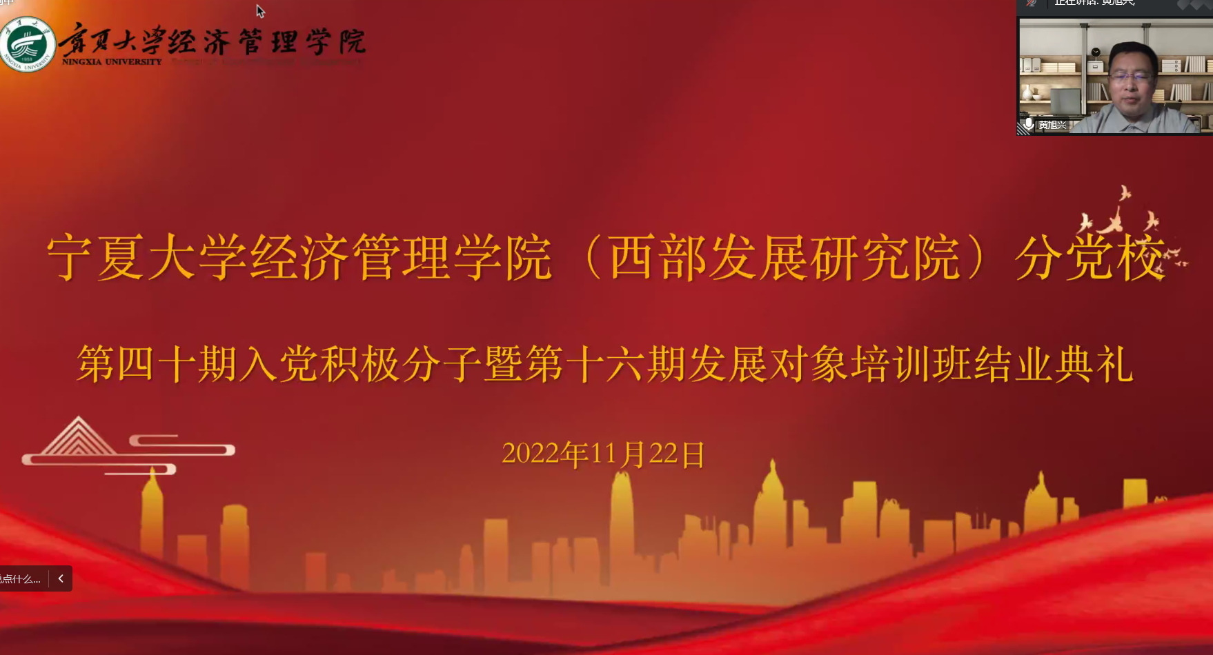 典礼在国歌声中隆重开幕。随即,姚硕宣读了此次培训中优秀、合格学员名单并对此做出了总结。黄旭兴表示本次培训坚持理论教学与实践教学相结合、线上与线下相结合的形式,使参训人员进一步加深对新时代党的建设总要求的理解和认识。他提出积极分子和发展对象们要进一步端正入党动机、加强理论学习、增强党性修养,坚持理论与实际相结合,投身于实践,增强历史责任感与使命感,牢记党的宗旨,发挥模范带头作用和示范作用,做到全心全意为同学服务。