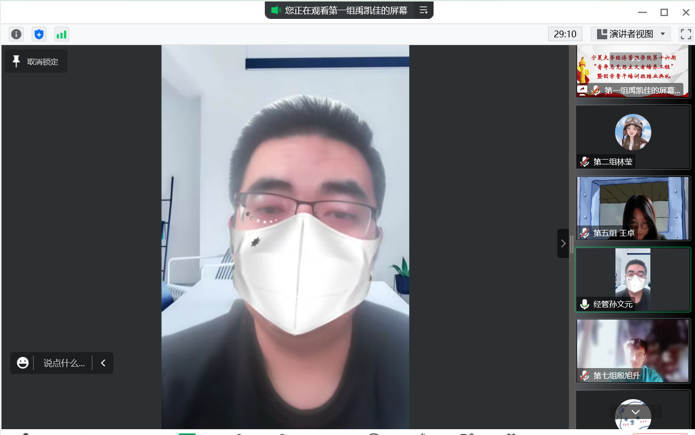 孙文元总结发言,他表示青马班学员要发挥示范引领作用,积极配合学校的疫情防控工作,了解同学们的所思所想并及时反馈。同时,他希望学员在社会实践、服务同学、学习生活上严格要求自己,勤学习、立远志、重实干,将好的状态坚持到底,并迎难而上,锤炼本领,磨炼意志,成为德智体美劳全面发展的社会主义合格建设者和可靠接班人。