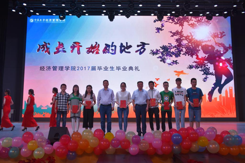 表彰结束后,最精彩的晚会节目来开序幕。开场一曲热烈奔放的爵士舞串烧《舞动青春》,如烈火青春激情四溢,点燃了现场气氛。一段《贺兰山下的那些年》的诗朗诵,青葱感伤,回忆悠长,令人不禁热泪盈眶,“请昂起头骄傲地走,因为你是经管人”道出观众心声。歌声飞扬,舞蹈绚丽,相声欢乐,现场气氛无比热烈。最后,在离别的歌声中,毕业典礼圆满落幕。