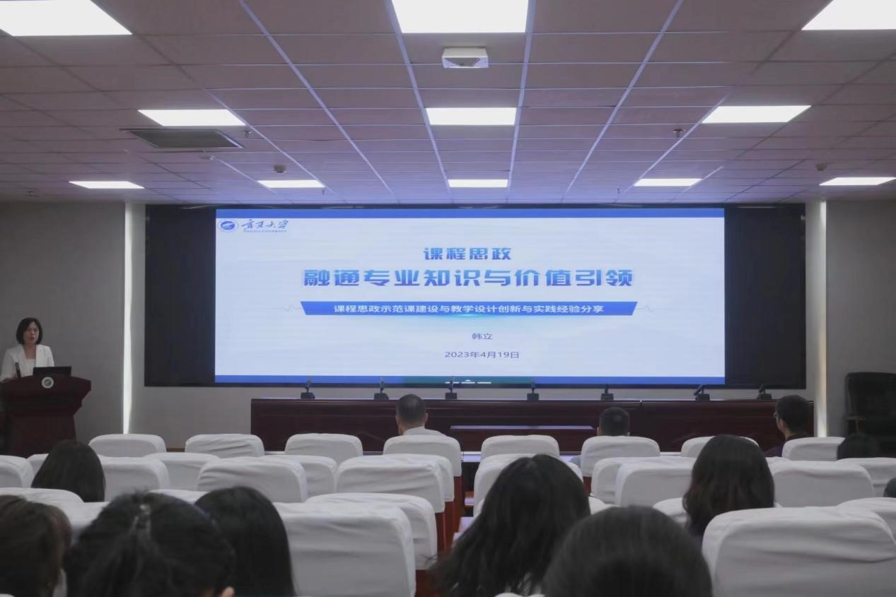 韩立教授以“融通专业知识与价值引领——课程思政示范课建设与教学设计创新与实践经验分享”为主题,讲解了课程思政的重要作用,阐述了课程思政的总体设计,表示教师要明确理念目标,分析相关学情,深度挖掘思政元素,选取典型的思政素材,落实到教学活动中去,通过教学评价提炼方法。同时,韩立分享了教学改革的建设成效,表示要不断分享经验,进行反思交流,从而完善教学资源,提升人才自主培养质量。