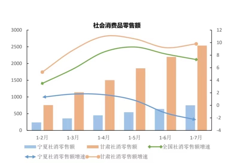 2022年上半年,宁夏出台了稳保促“50条”、消费恢复“30条”、扩大消费“17条”等一系列政策措施,统筹政府促销资金超2亿元,带动社会投入1.7亿元,消费促进工作直 接带动消费12.7亿元,间接拉动消费70.8亿元。具体来看,2022年上半年,宁夏全区社会 消费品零售总额649.42亿元,同比增长1.4%,比1-5月份加快1.4个百分点。其中,6月份, 全区社会消费品零售总额同比增长8.9%,比5月份加快14.4个百分点,比全国高5.8个百 分点。从当期数据看,6月份全区实现社会消费零售总额97.21亿元,比同期净减少11.97亿元,同比下降12.3%,下拉1-6月份社会消费品零售总额增2个百分点。