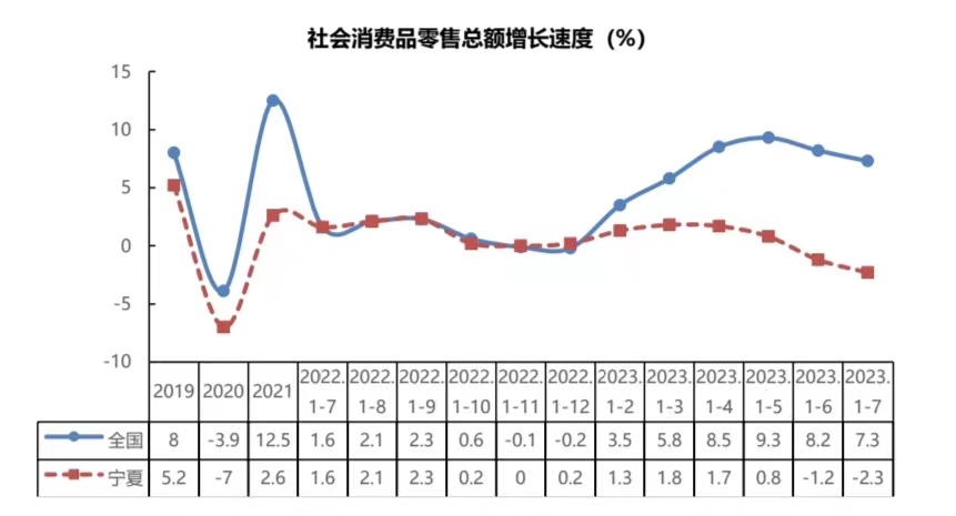 反观全区消费增长的实际,2023年1-7月全区社会消费品零售总额同比下降2.3%、比 全国低9.6个百分点,连续5个月回落。这里面既有微观层面消费者消费理念转变的因素, 也有中观层面产业发展后劲不足的问题,还涉及到宏观层面的刺激消费的政策缺乏有效性的 客观事实,但更深层次的原因还在于对区域性消费大市场培育不足的问题。
